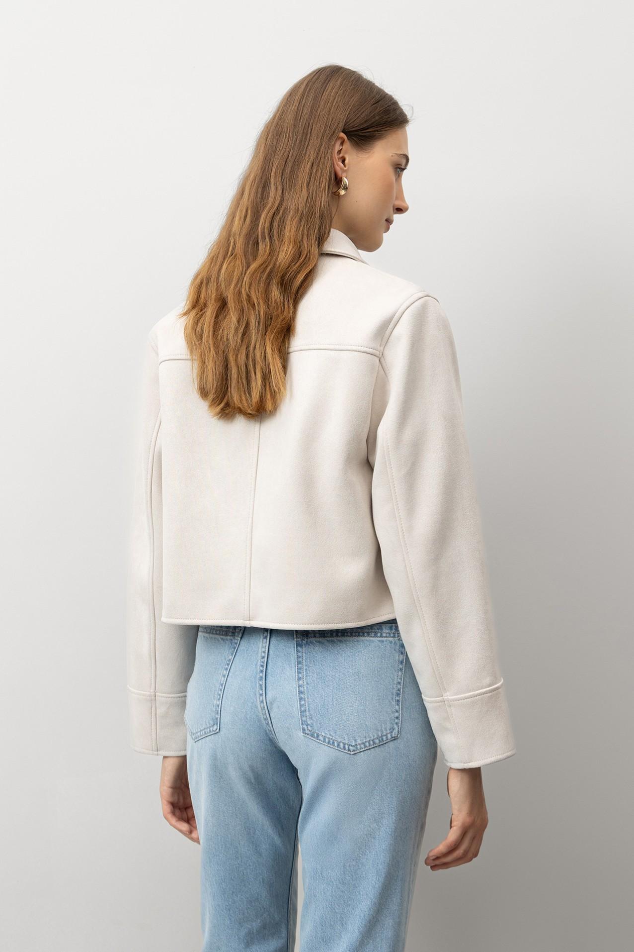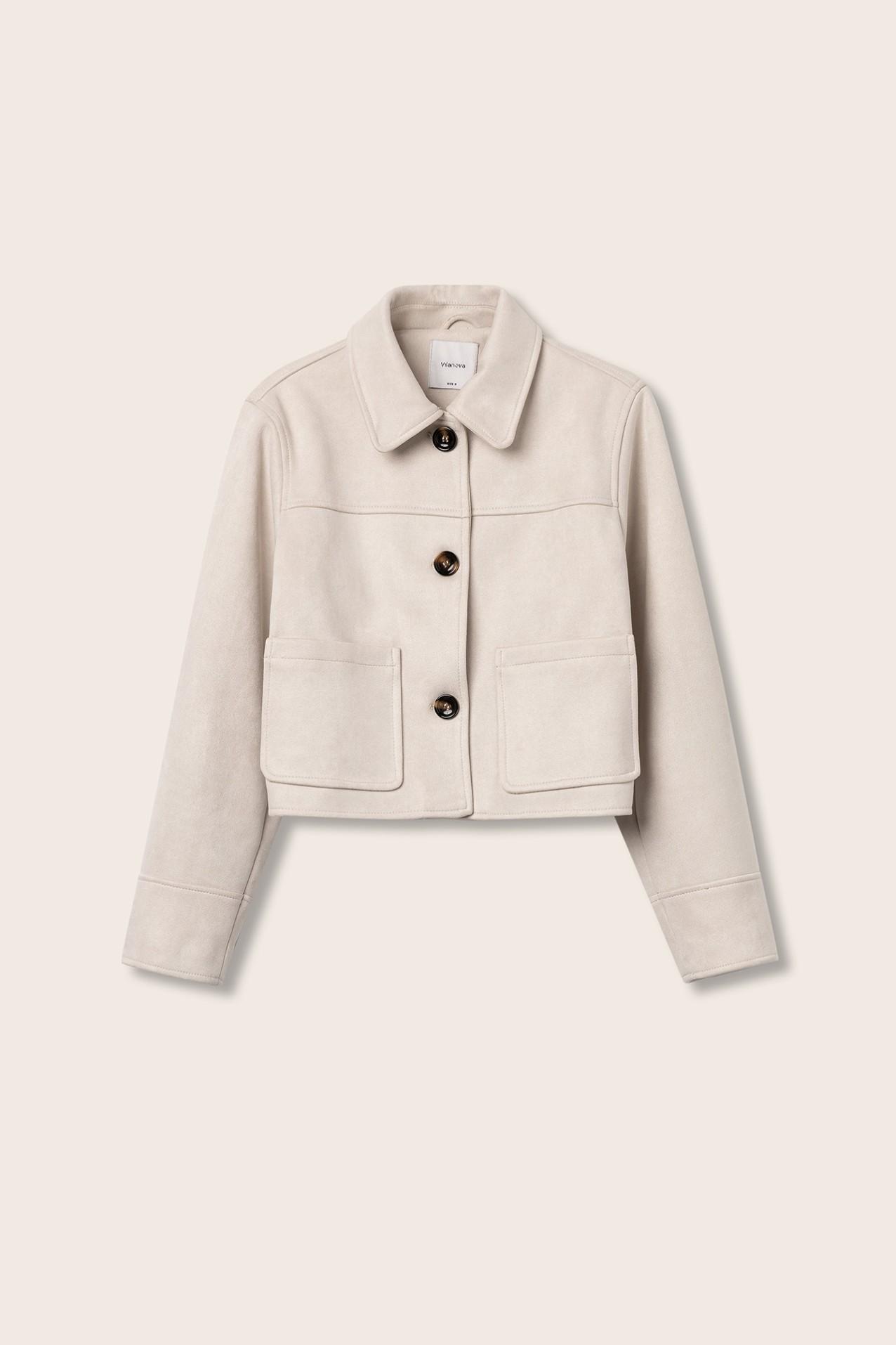 Chaqueta regular fit efecto ante, con dos bolsillos de parche frontales y cierre de botón. Cuello camisero y manga larga