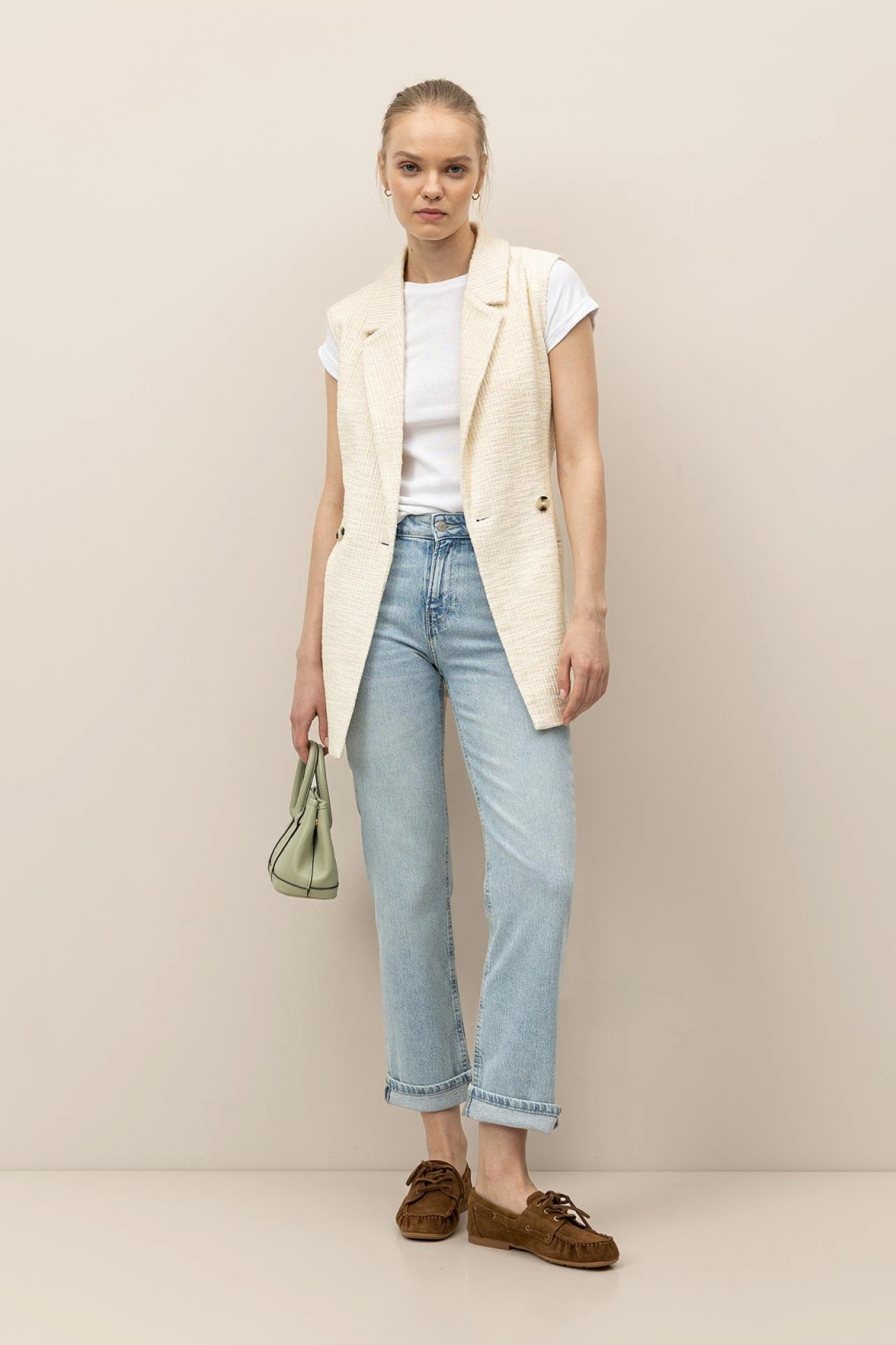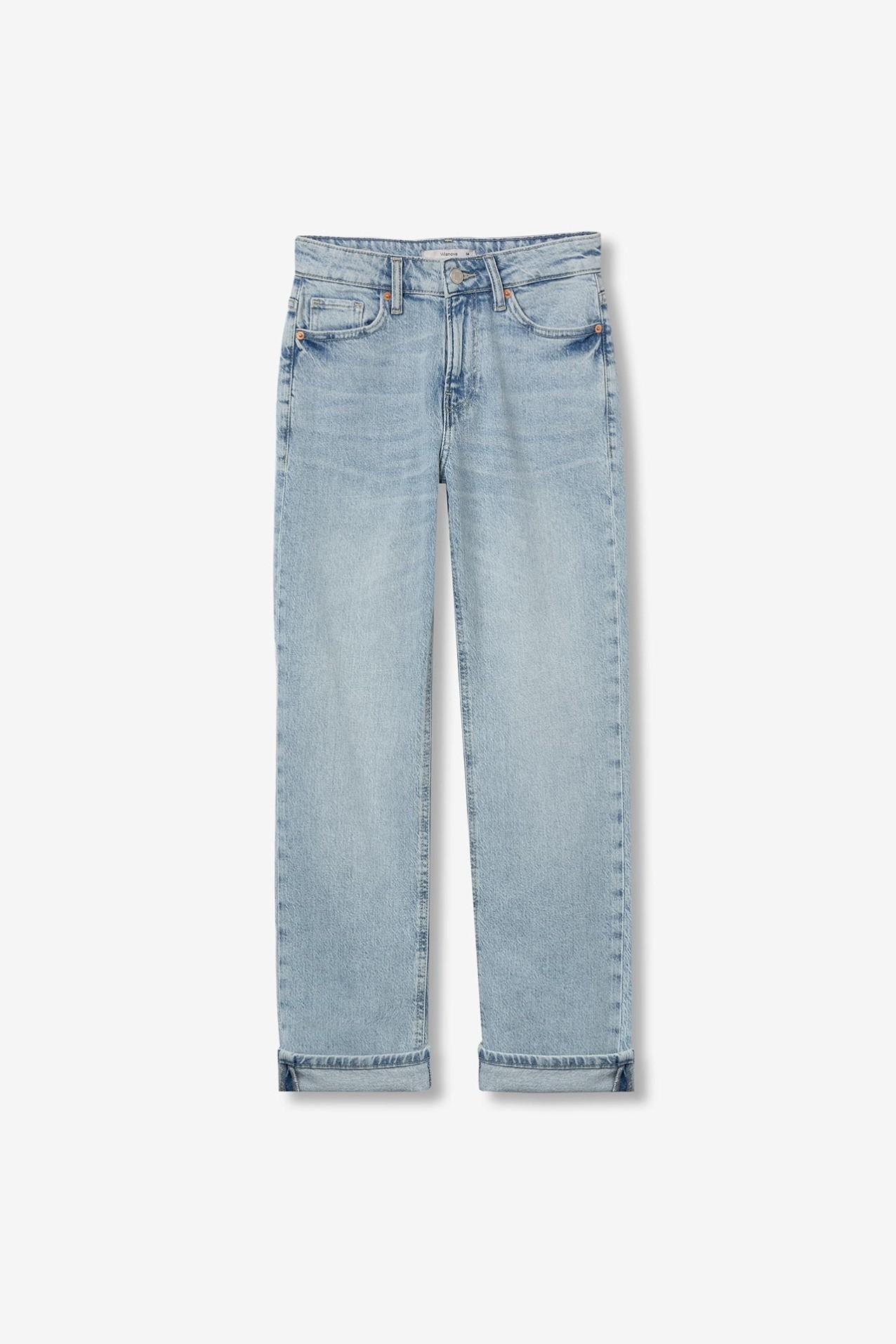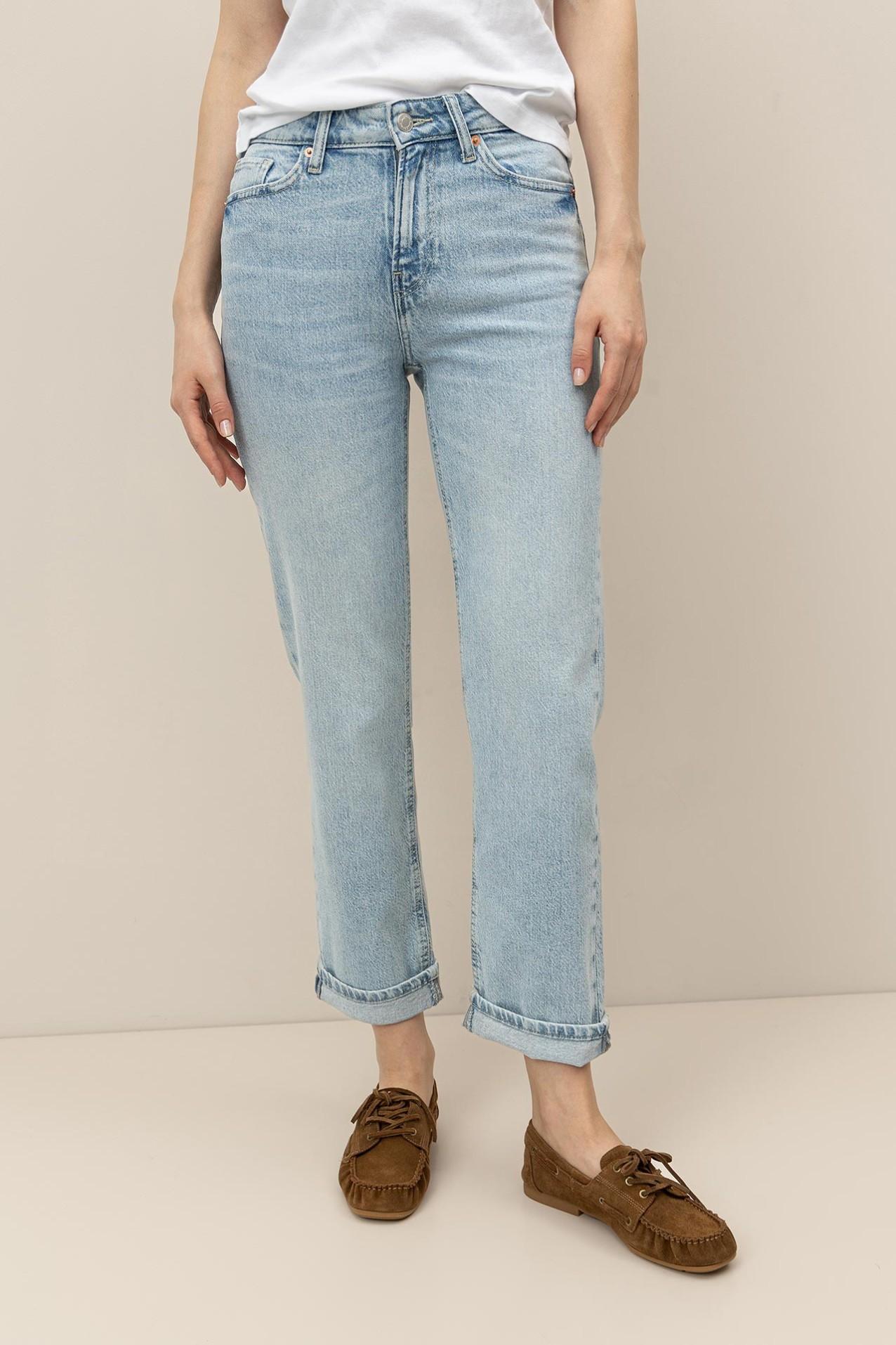 Jeans Oslo Straight Fit con elastano, cintura media, lavado claro stonewash y dobladillo enrollado. Cinco bolsillos y cierre frontal con botón y cremallera.