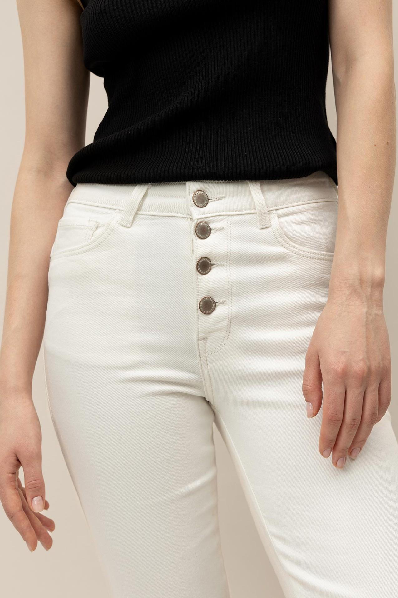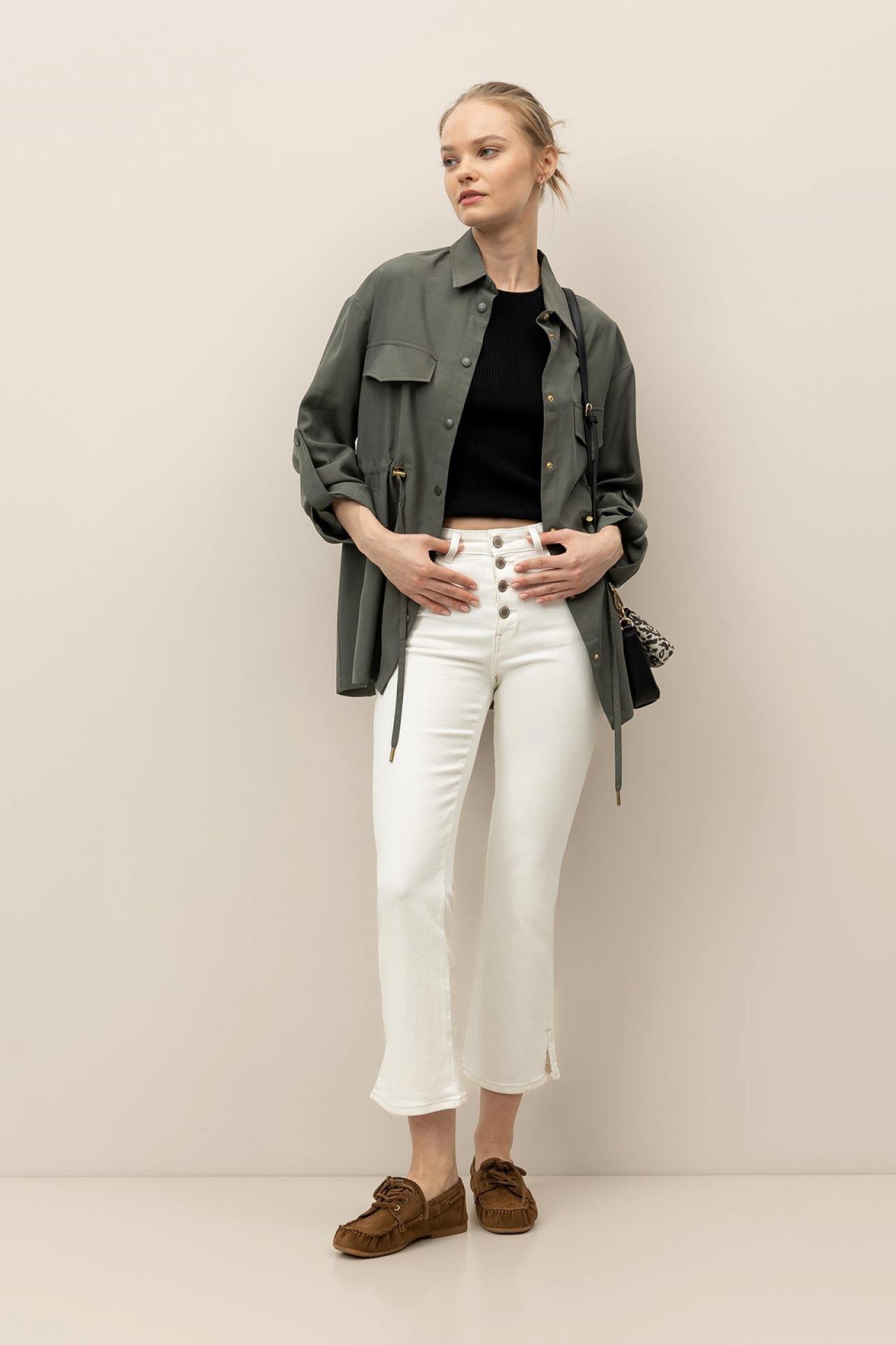 Jeans Paris Cropped Flare con elastano, cintura media, pierna ajustada y cinco bolsillos. Cierre frontal con cremallera y botón metálico. En sarga cruda