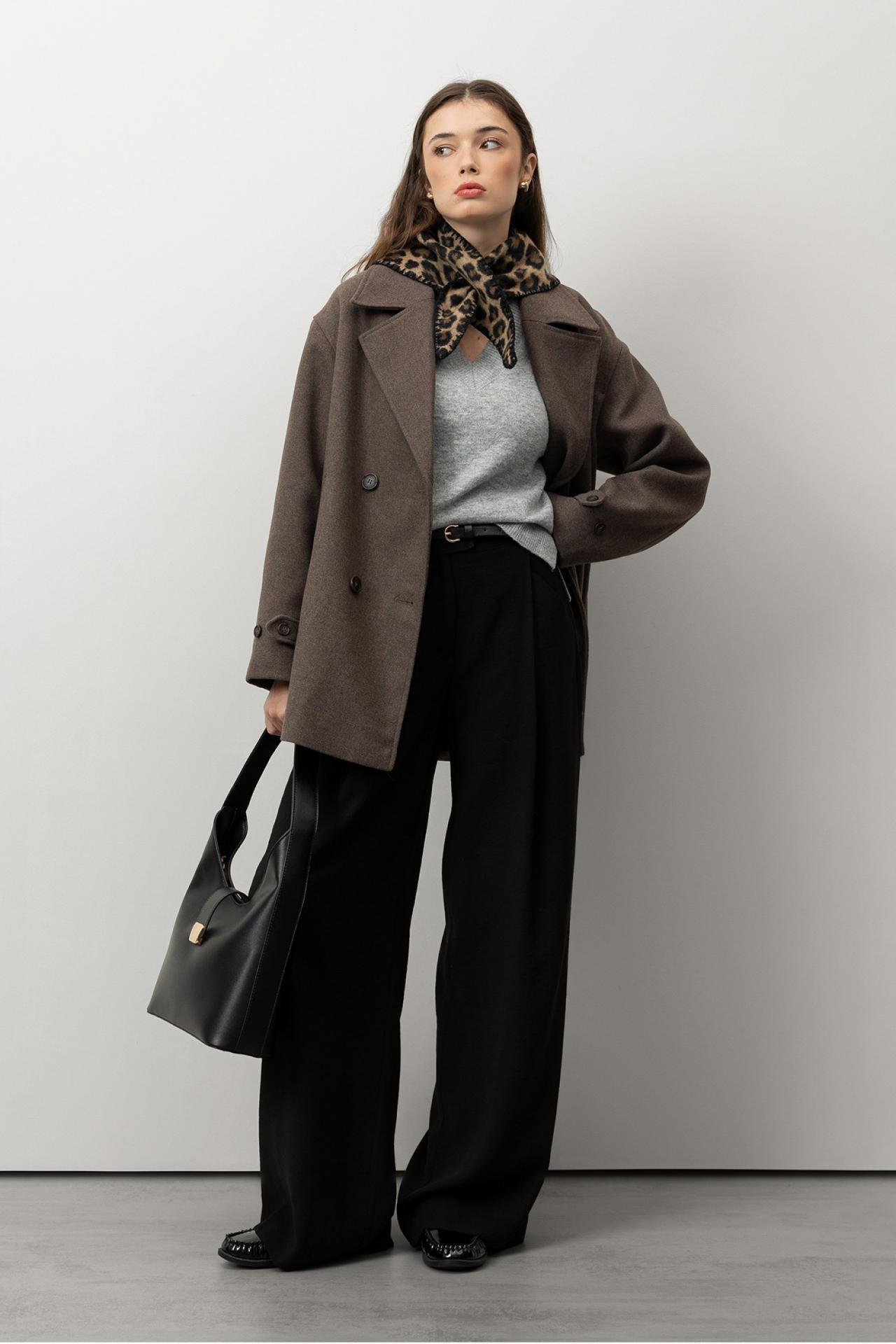 Pantalones wide leg con cinturón efecto piel desmontable, pliegues, dos bolsillos frontales y detalles decorativos traseros. Cintura alta, abertura frontal con cremallera, botón y gancho interior.