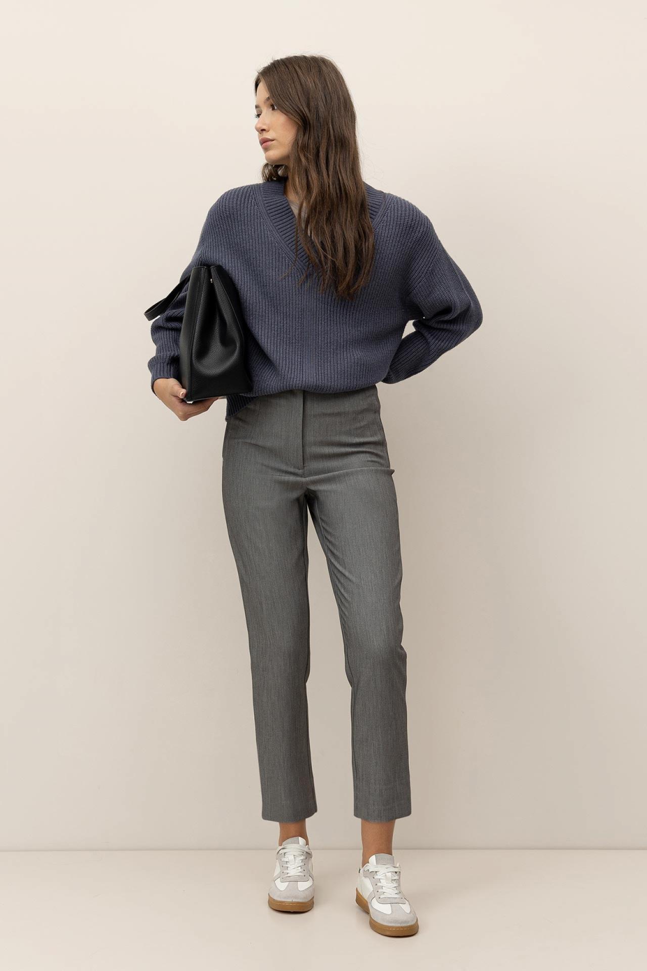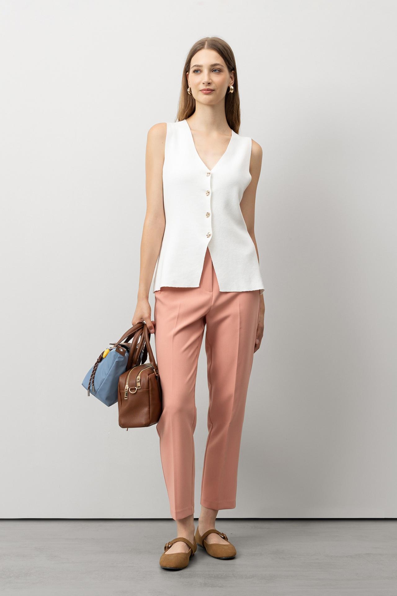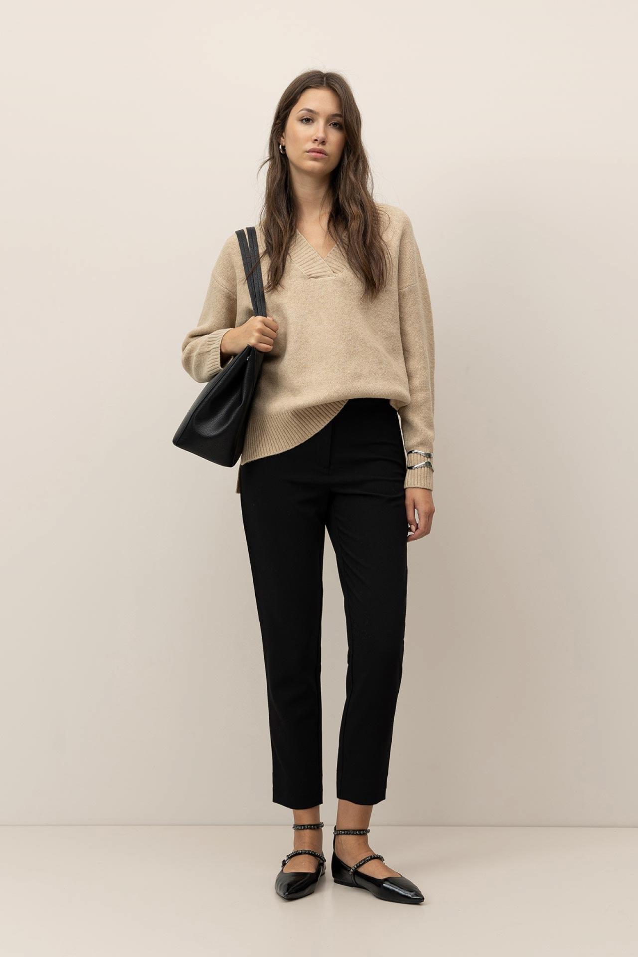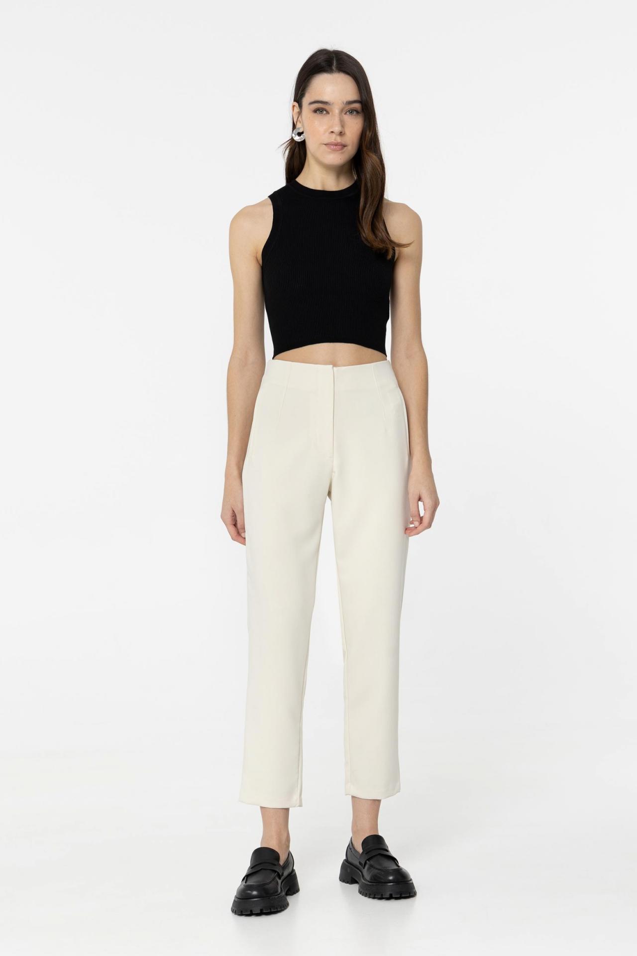 Pantalones de cintura alta con bolsillos falsos laterales. Cierre frontal con cremallera, gancho y botón interior.