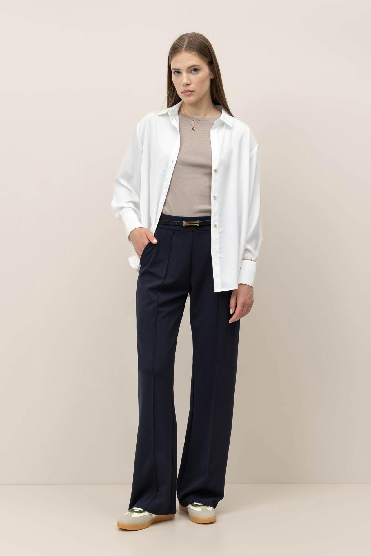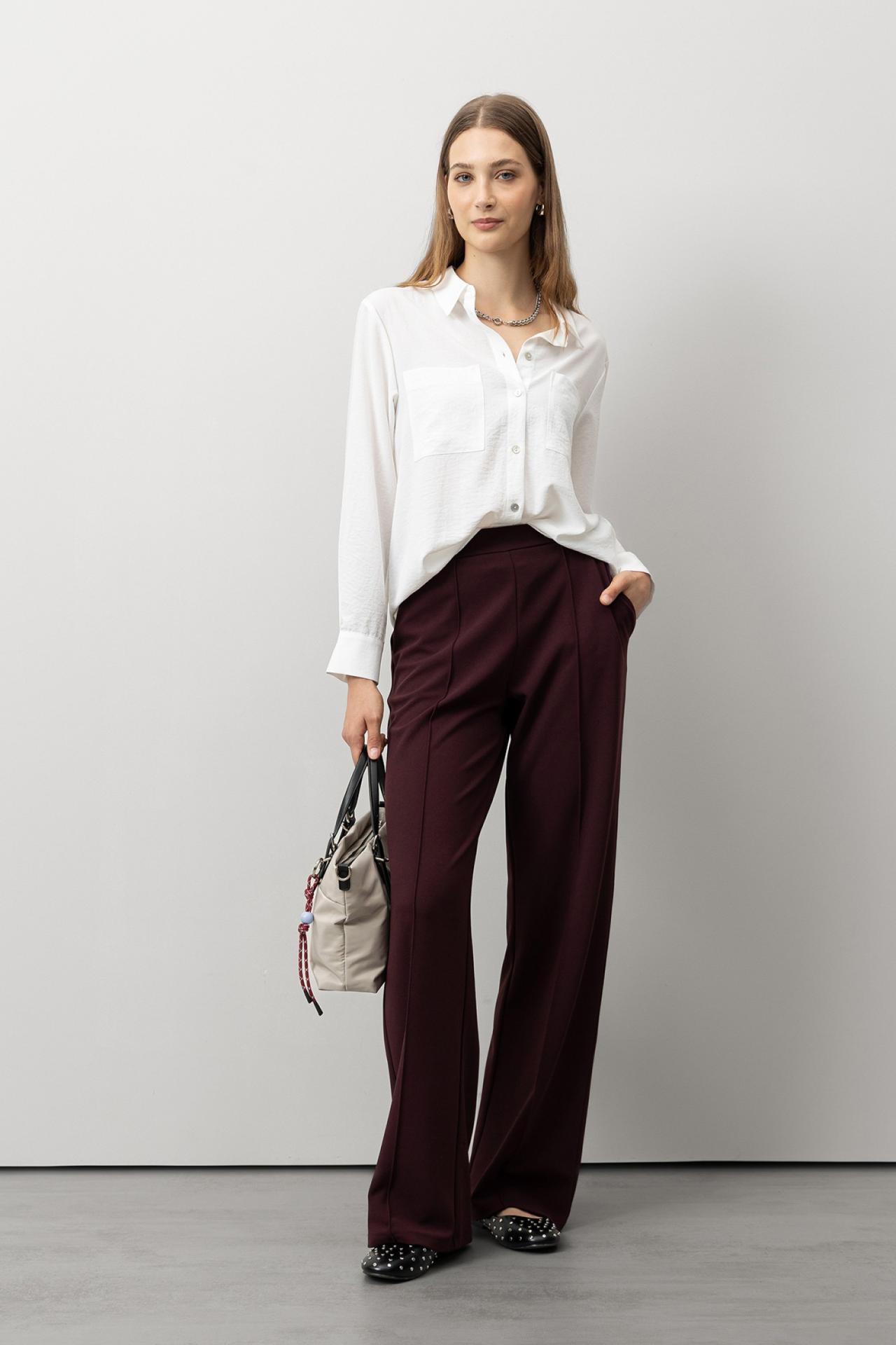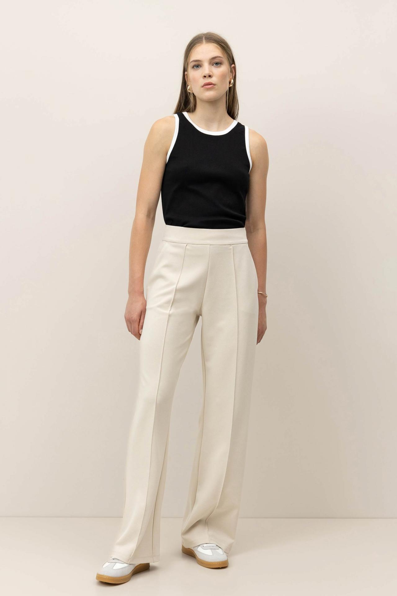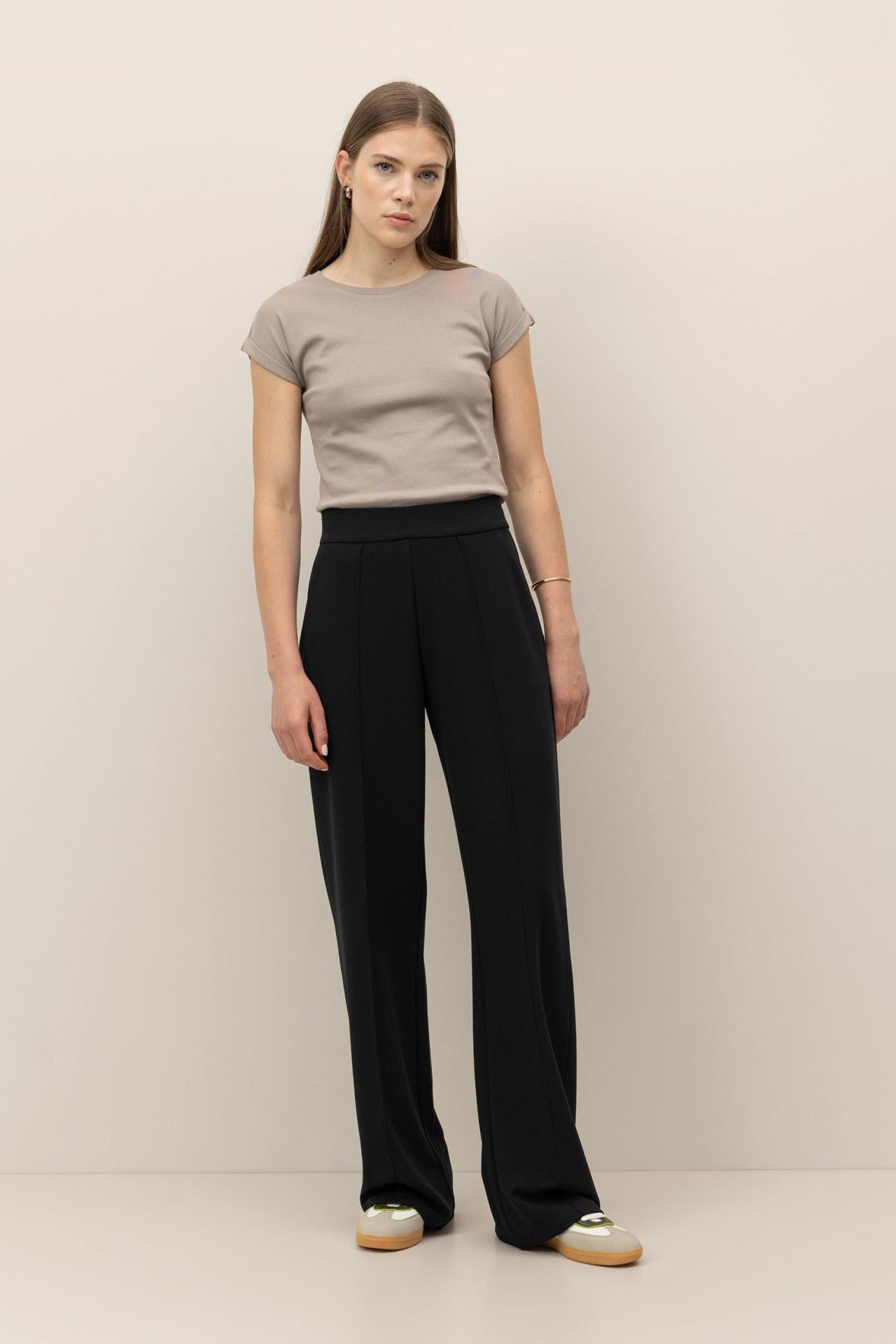 Pantalones wide leg, de punto con cintura alta, costuras frontales y dos bolsillos.