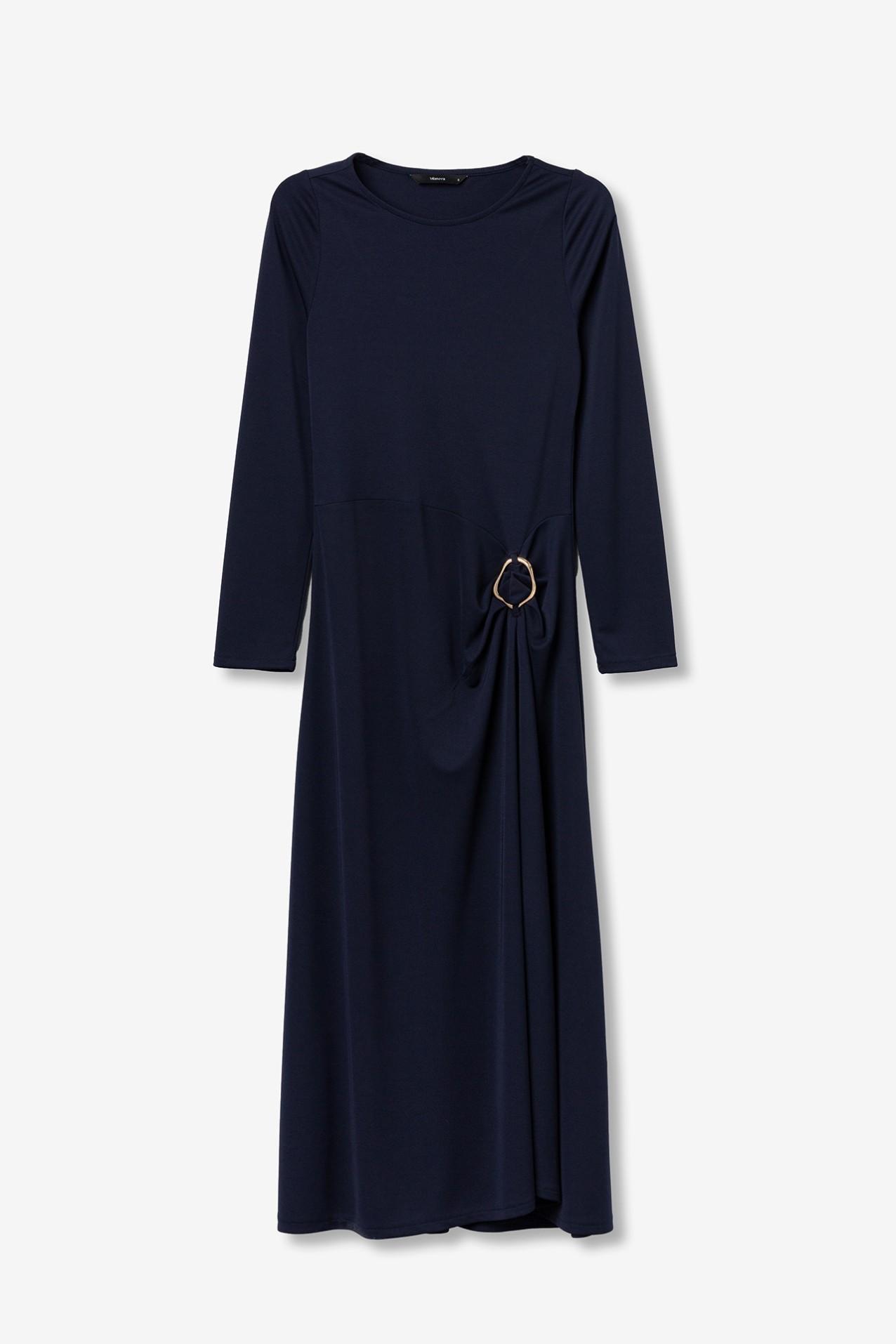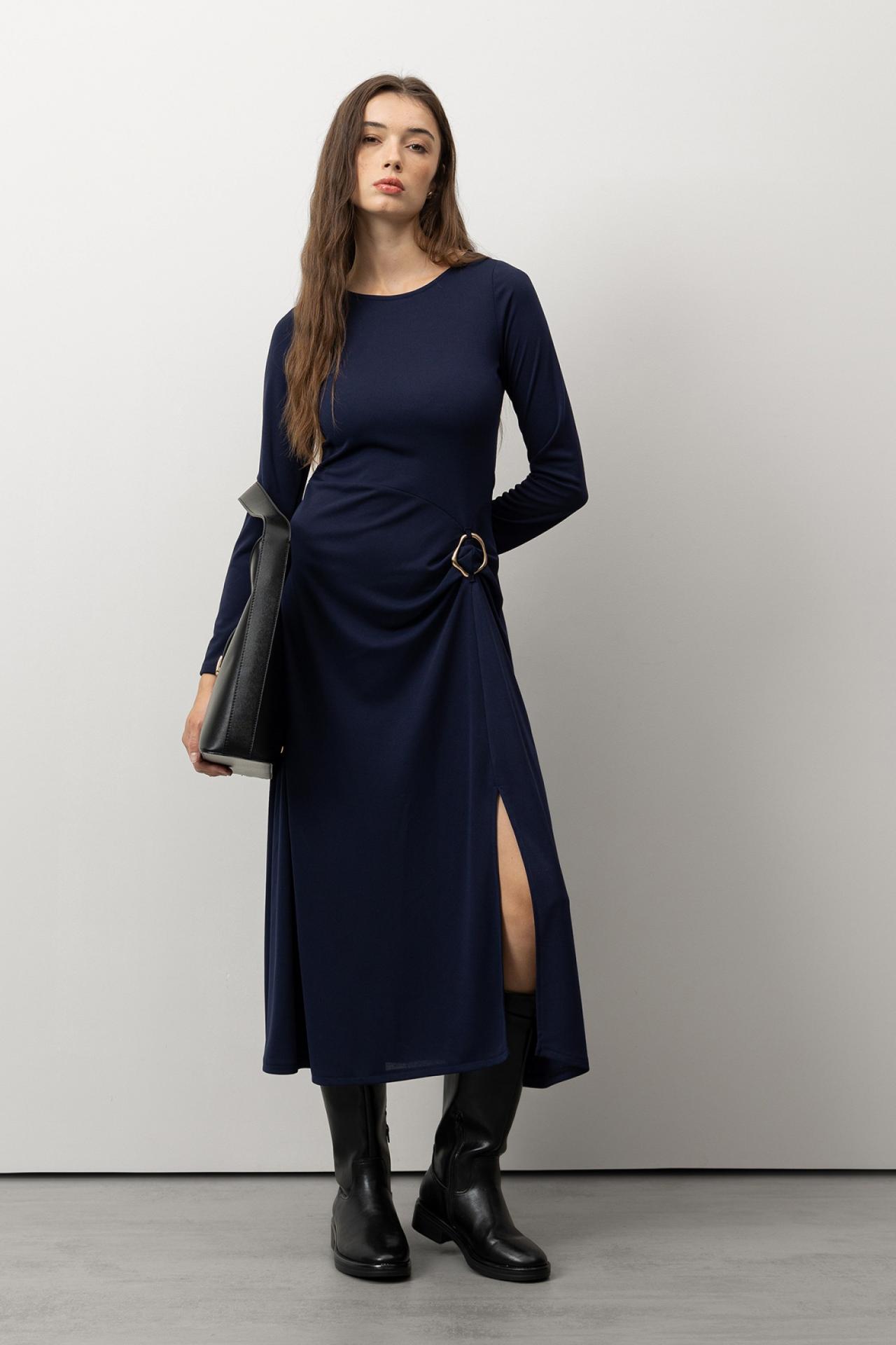 Vestido azul oscuro con fenda lateral, detalle de argolla y corte regular elegante.