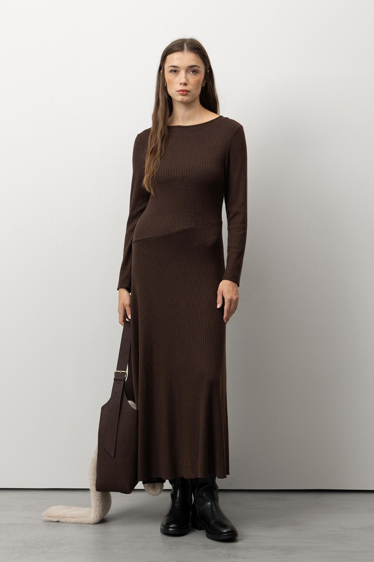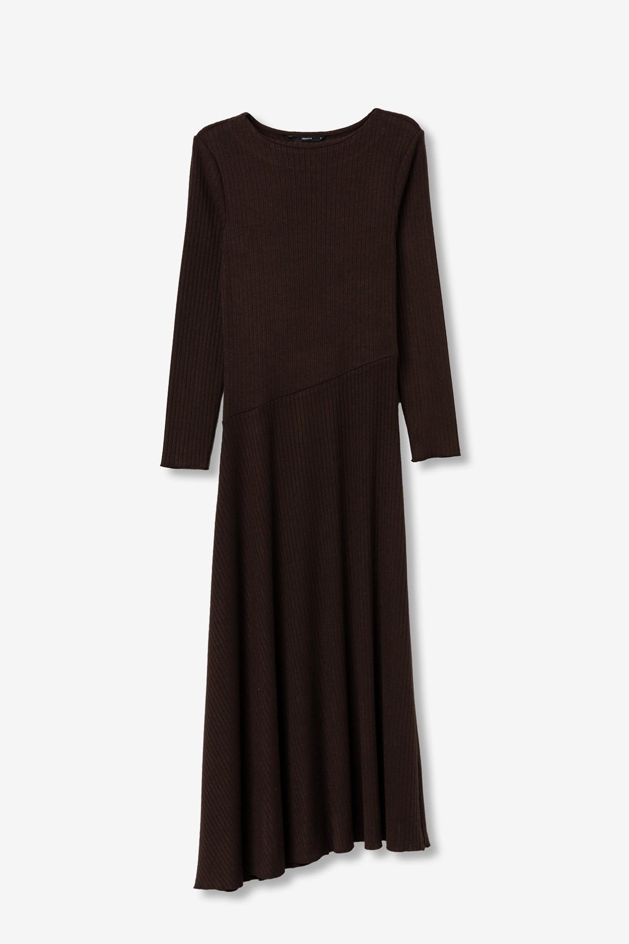 Vestido marrón de corte regular, con mangas largas y tejido acanalado, perfecto para días frescos.
