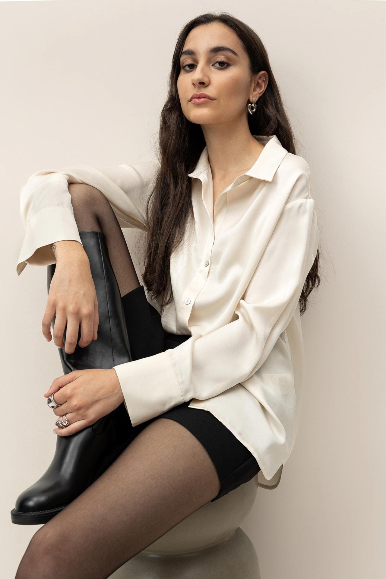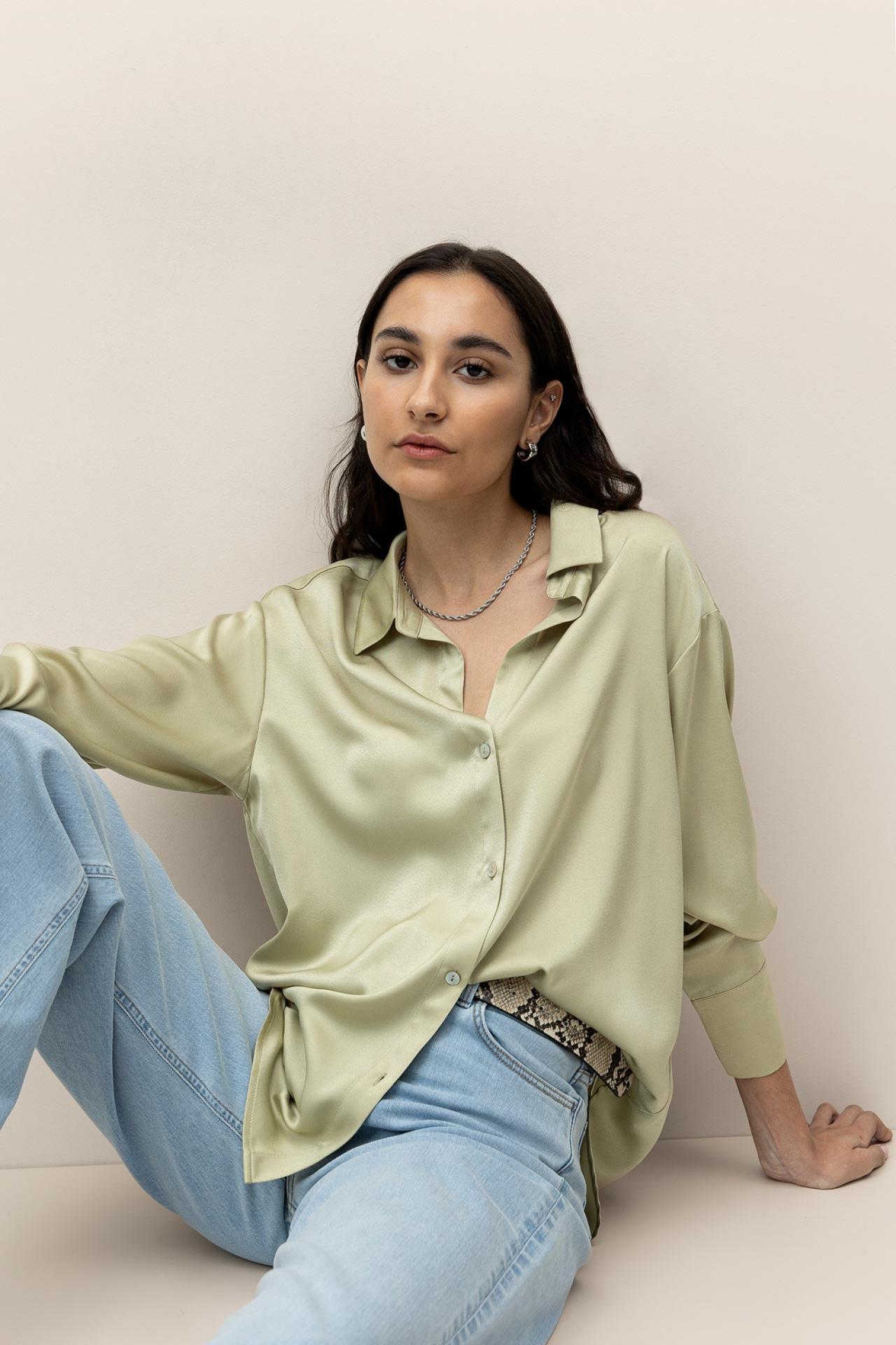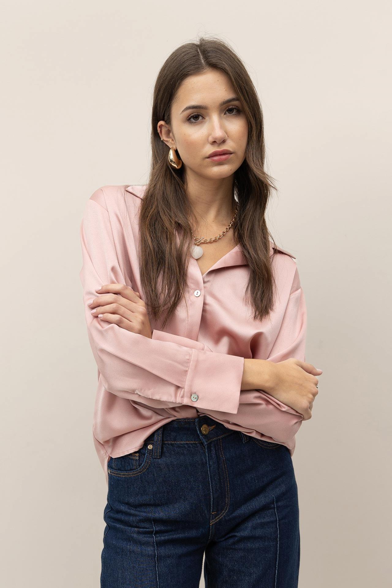 Camisa de raso, corte relajado, con abertura frontal y cierre de botones. Escote de pico con cuello, manga larga con cierre de botones en los puños y bajo redondeado asimétrico.