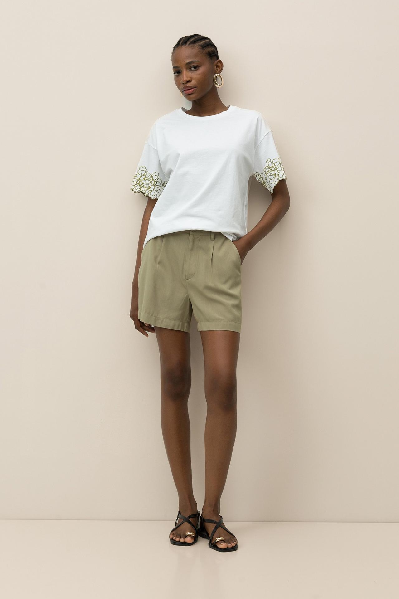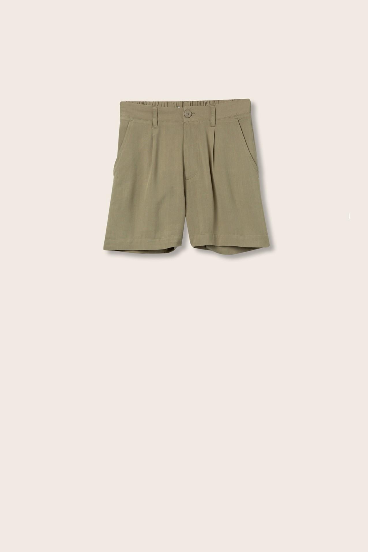 Pantalones cortos regular fit con dos bolsillos frontales. Cintura alta elástica y abertura frontal con cremallera y botón