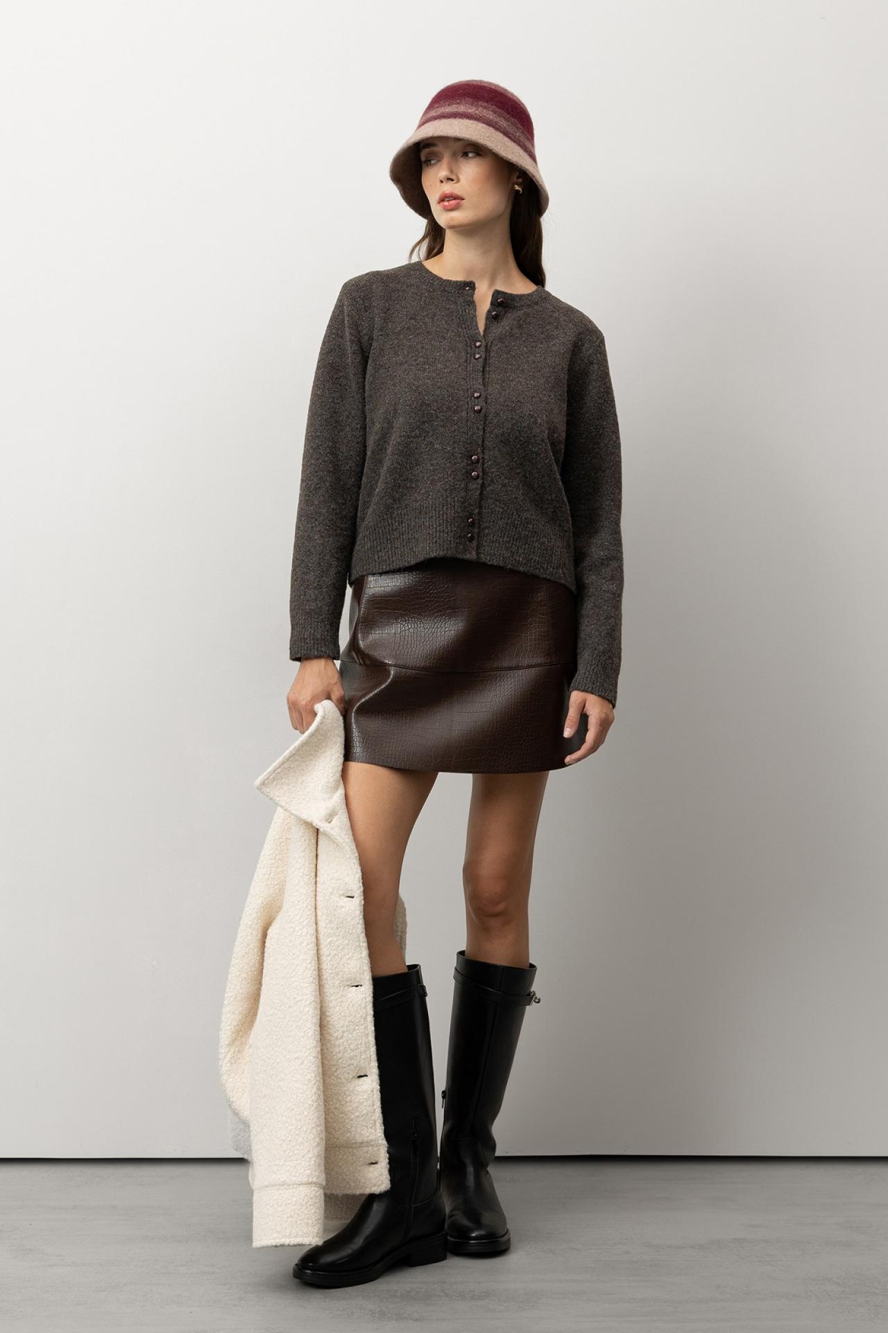 Falda corta marrón con textura de piel, corte regular y diseño moderno.