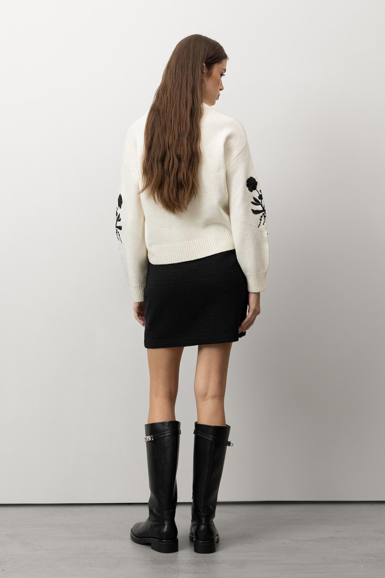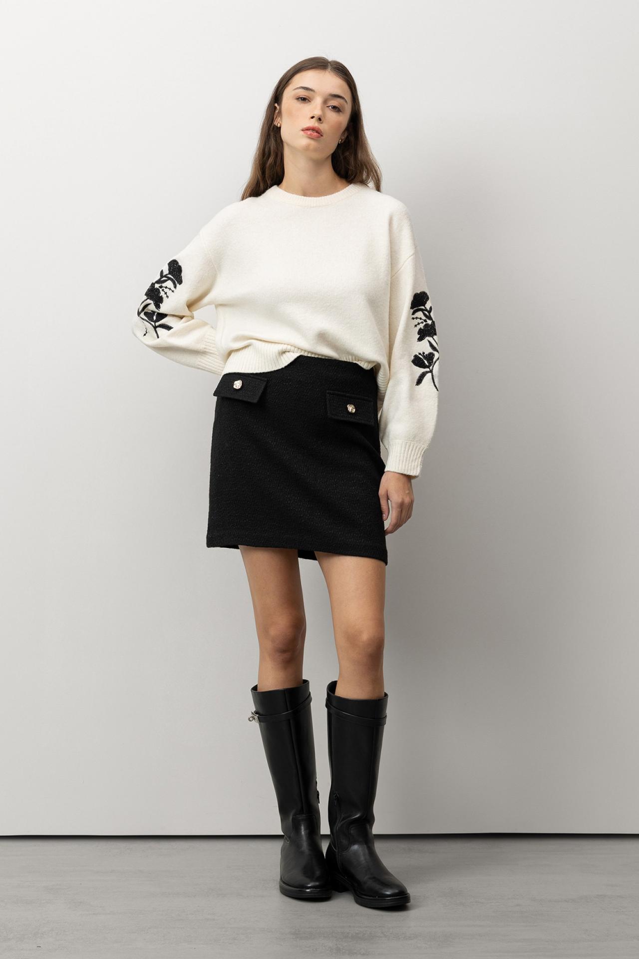 Falda negra de corte regular con bolsillos decorativos y botones brillantes, ideal para un look casual.