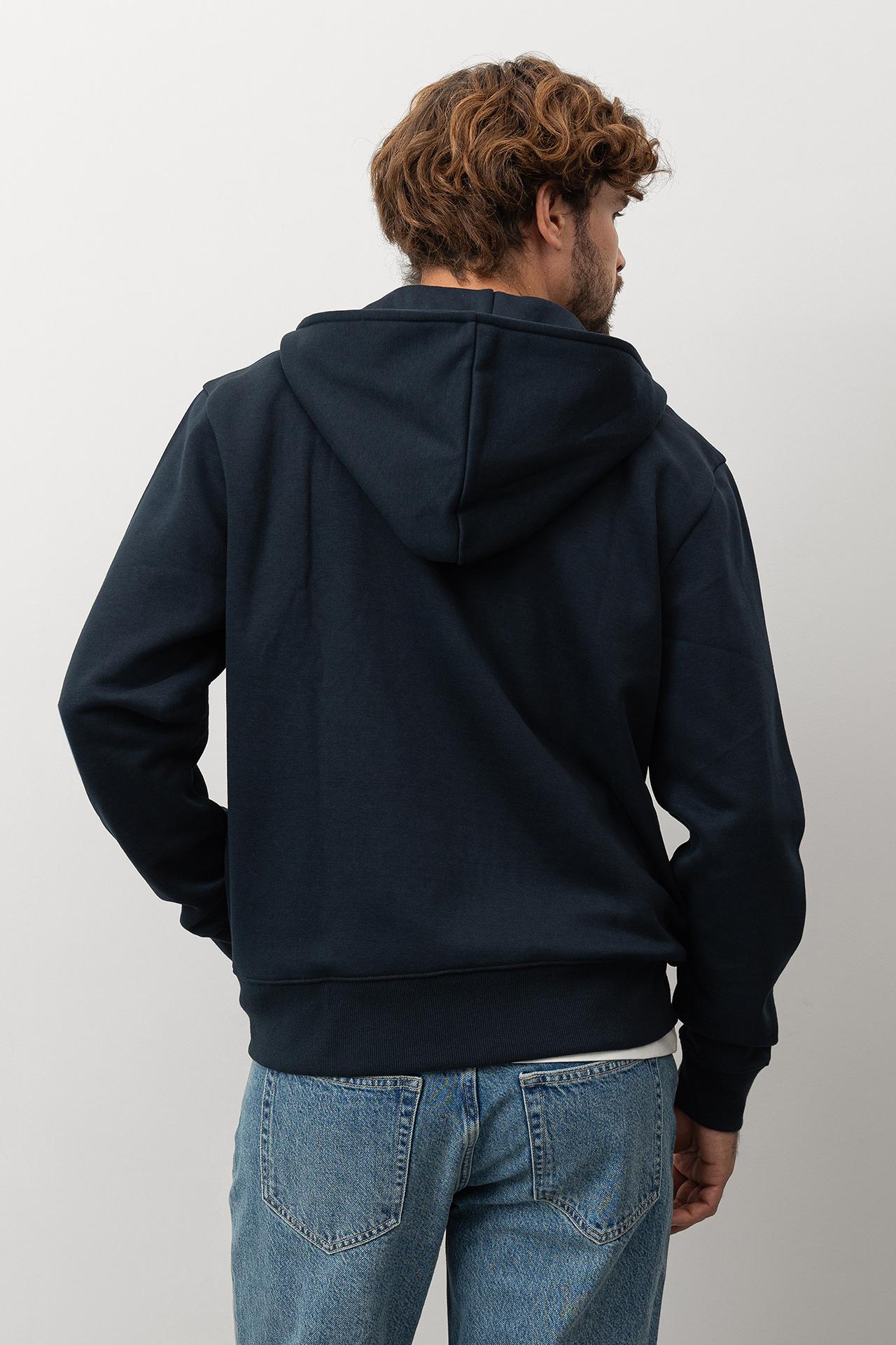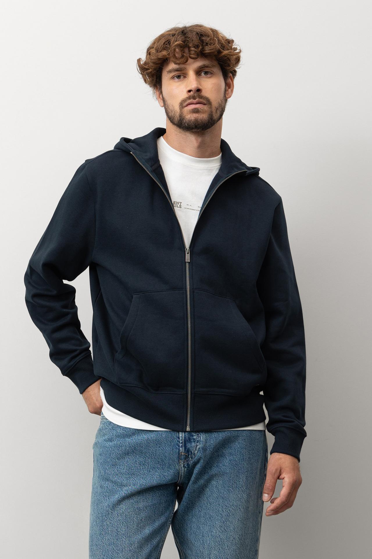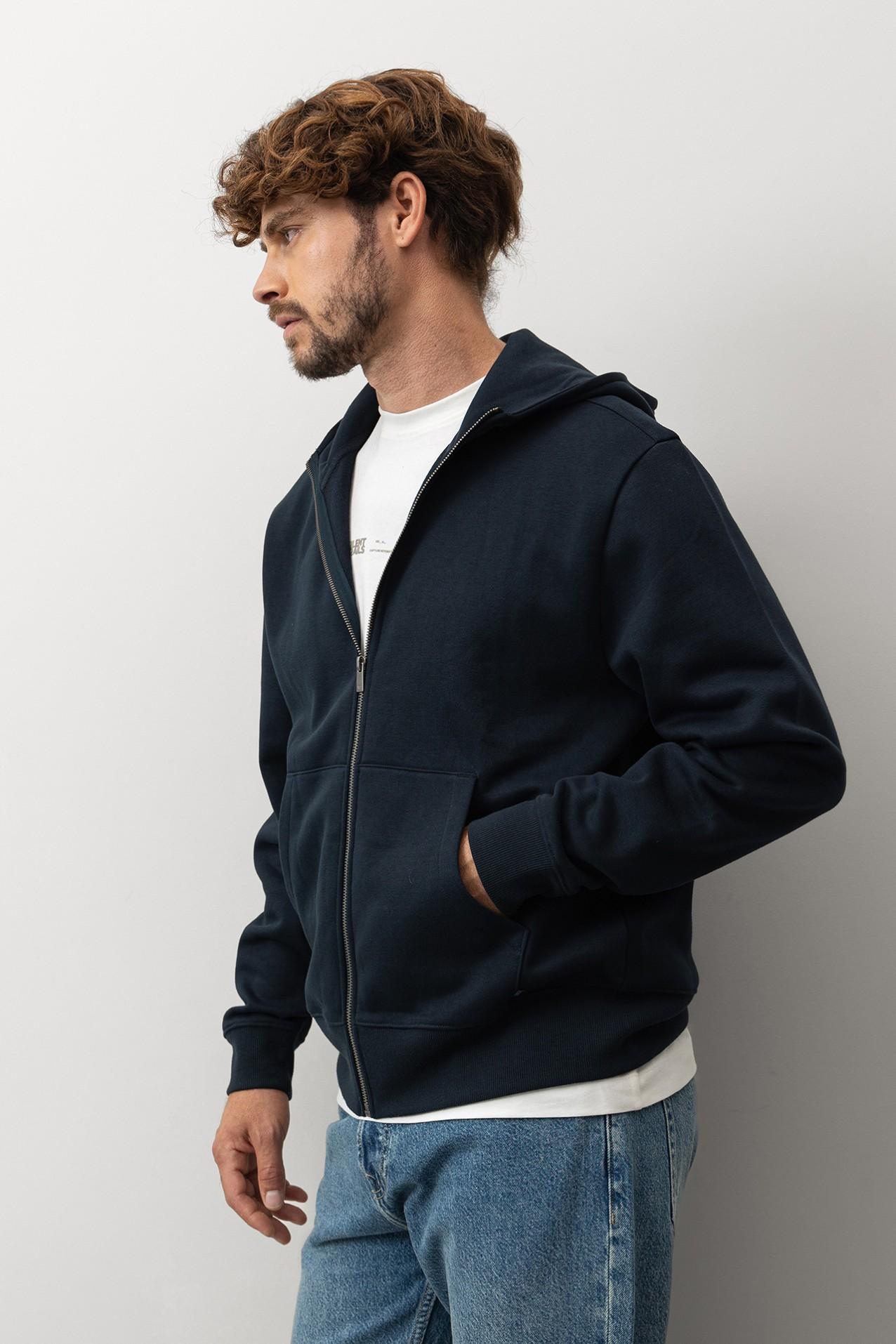 Casaco regular azul marinho escuro con capucha, cremallera frontal y bolsillos tipo canguro.