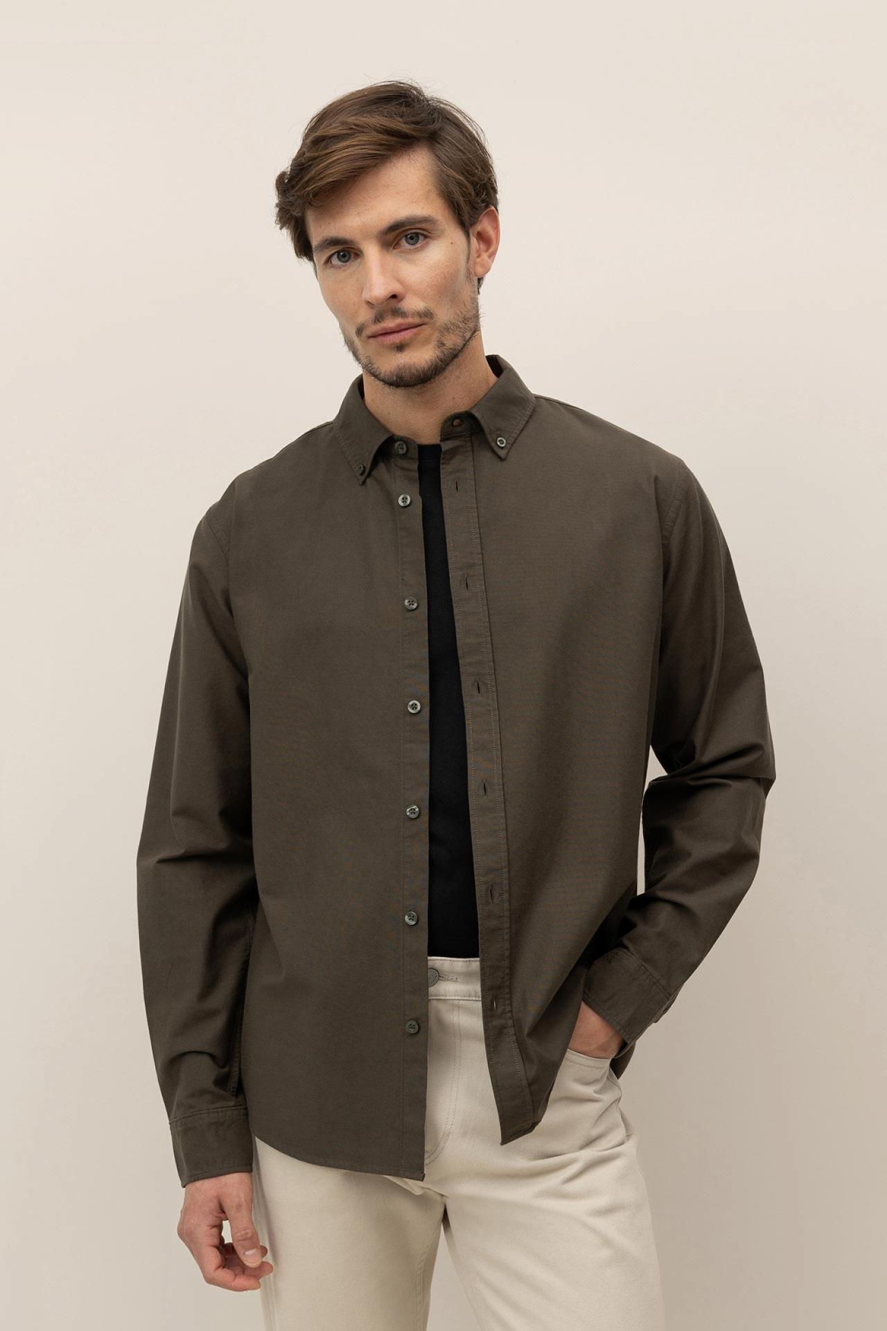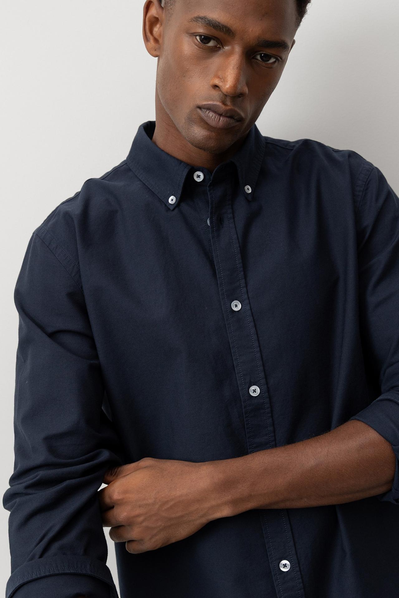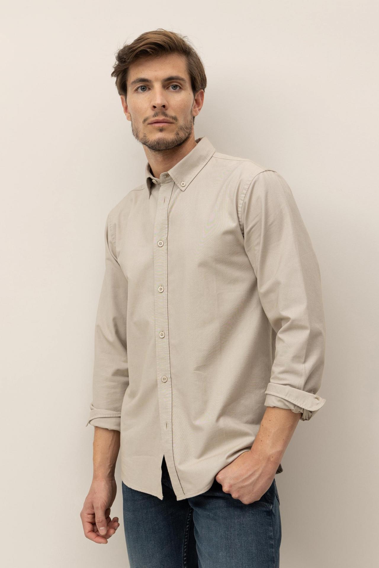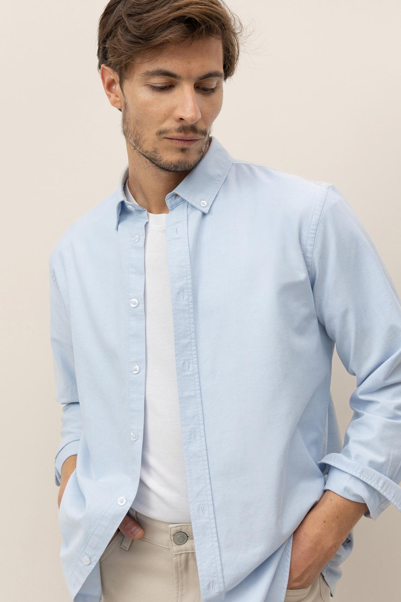 Camisa Oxford regular fit, confeccionada en 100% algodón, con cuello slim, abertura frontal con cierre de botones, manga larga con ajuste de botones en los puños y bajo redondeado.