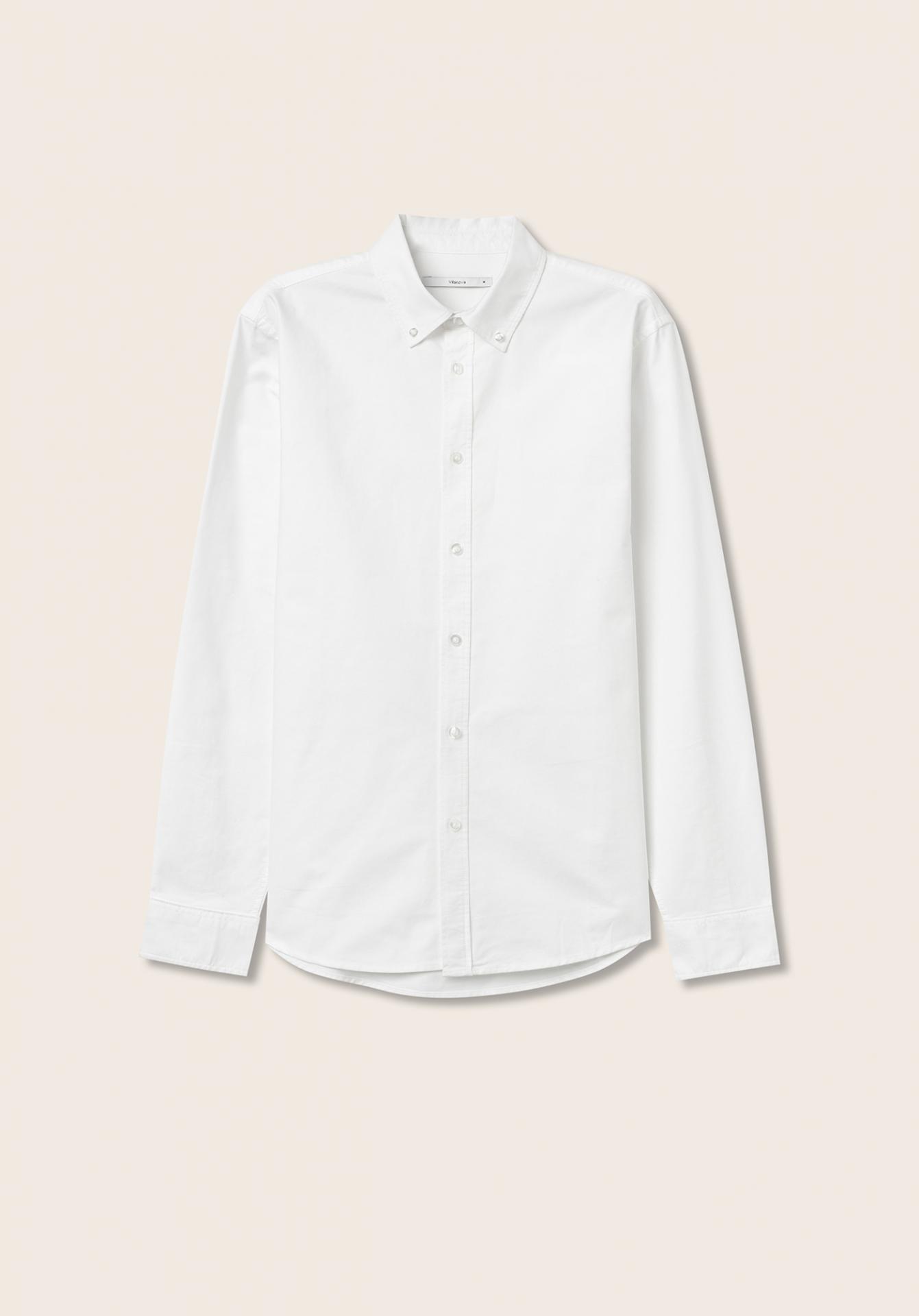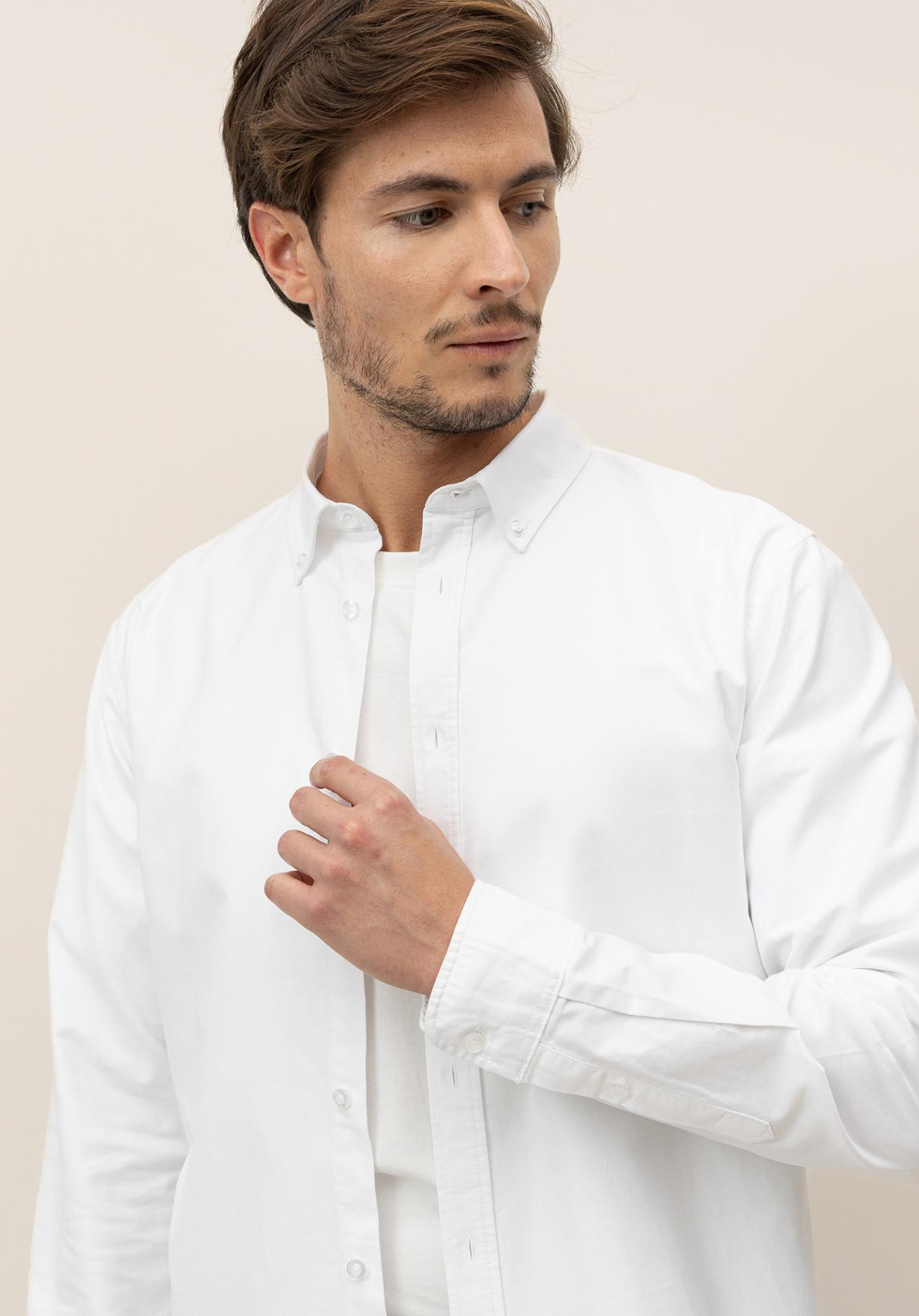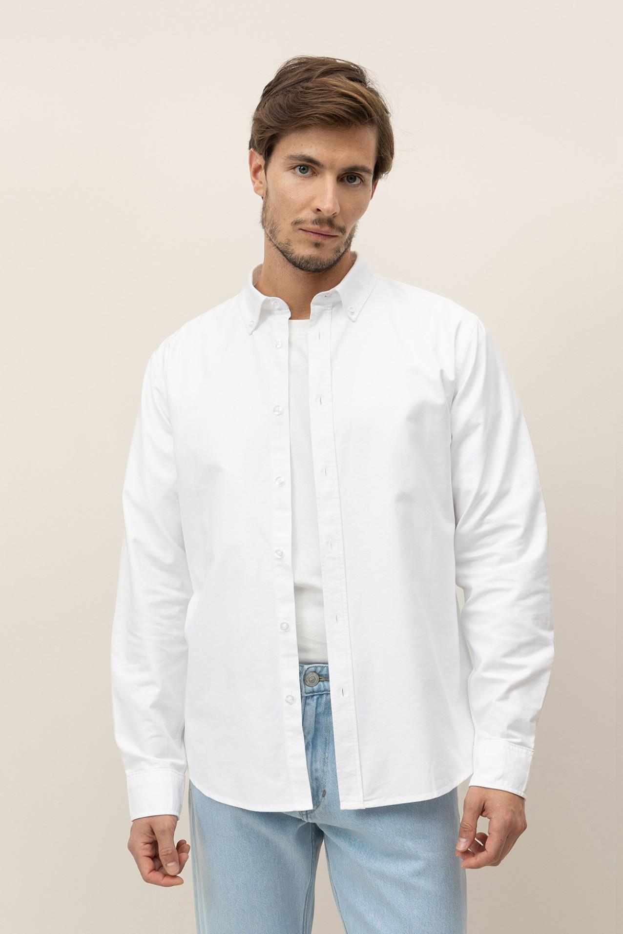 Camisa Oxford regular fit, confeccionada en 100% algodón, con cuello slim, abertura frontal con cierre de botones, manga larga con ajuste de botones en los puños y bajo redondeado.