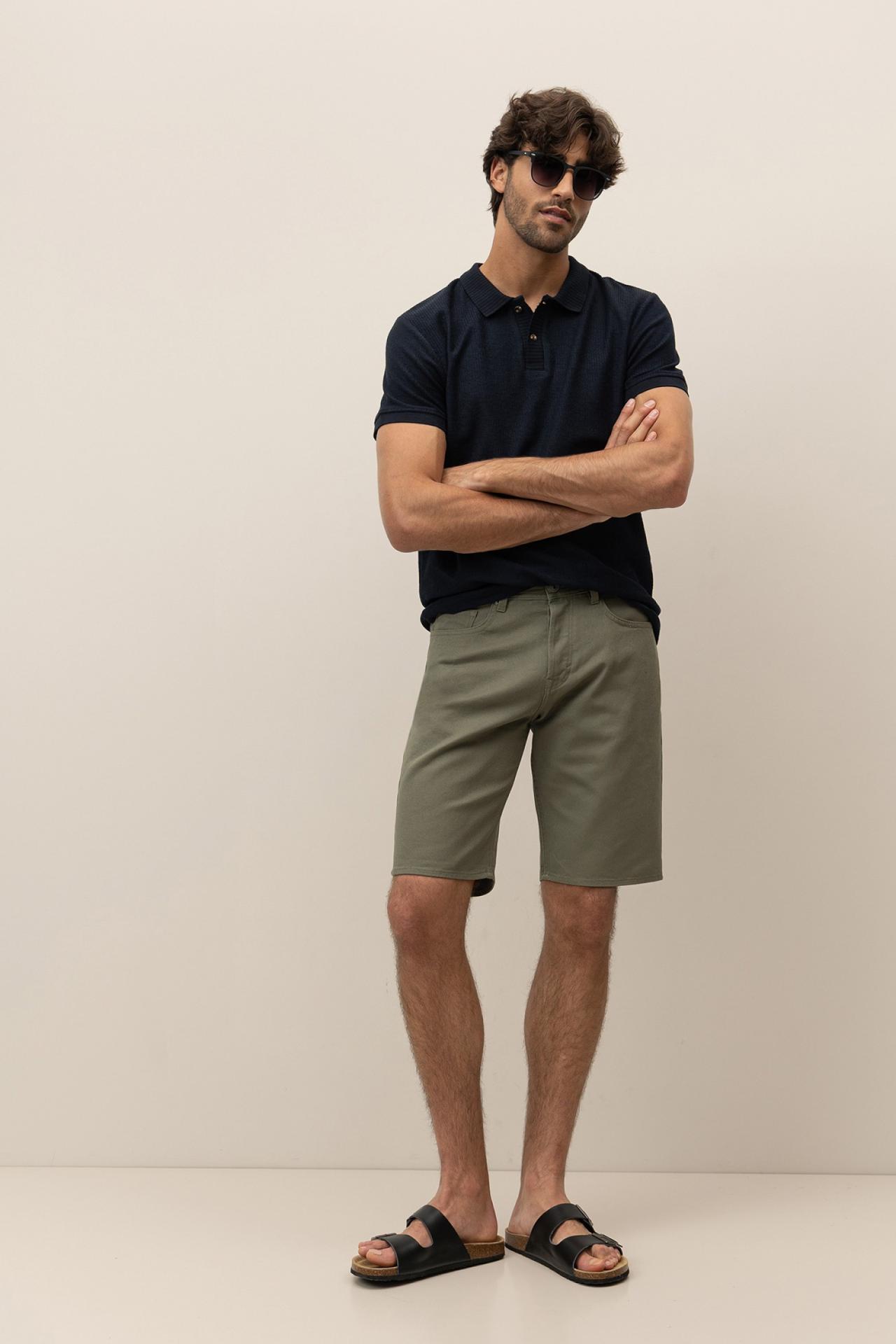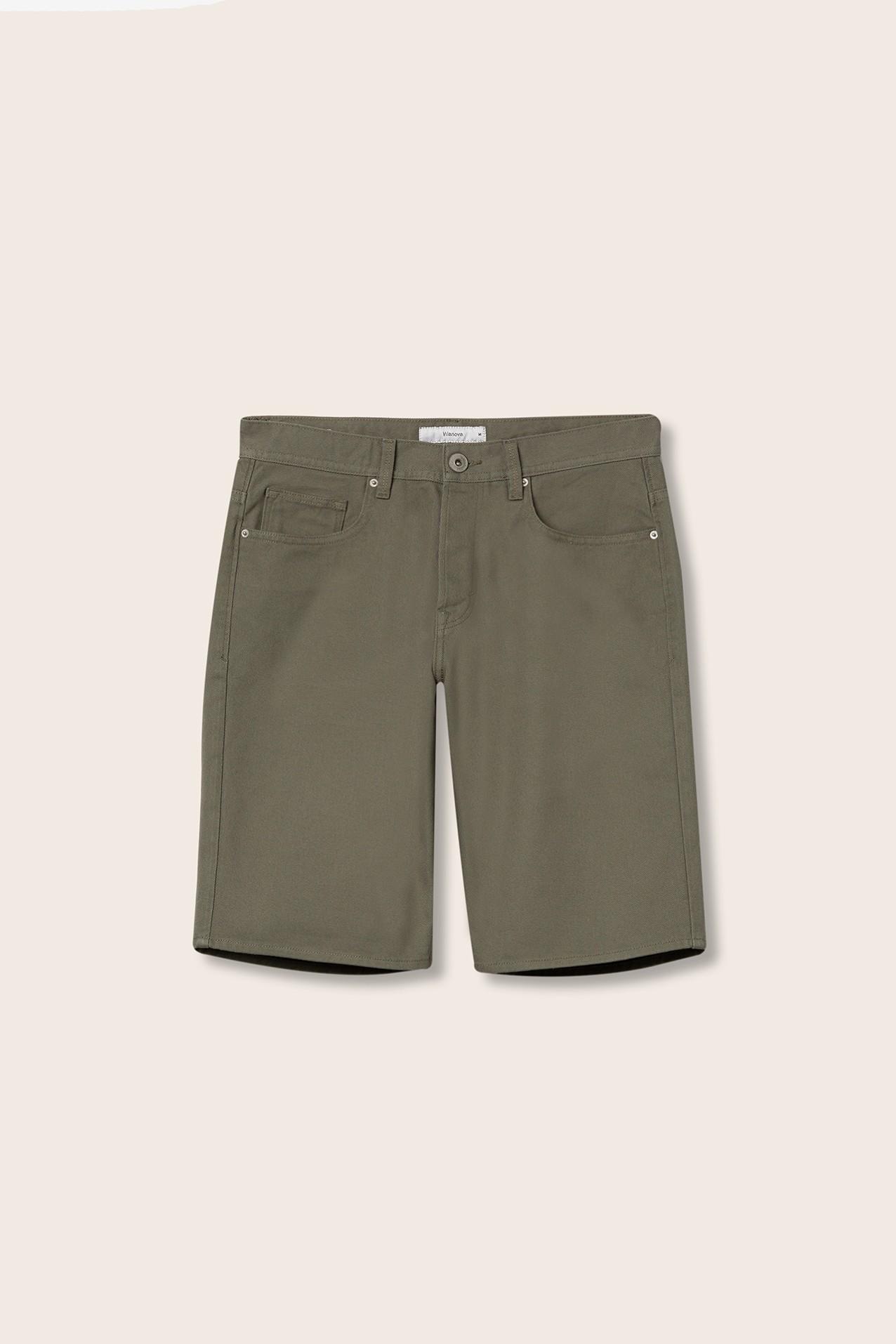 Pantalones cortos regular fit, de sarga 100% algodón, con cinco bolsillos y dobladillo vuelto. Abertura frontal con cierre de cremallera y botón.