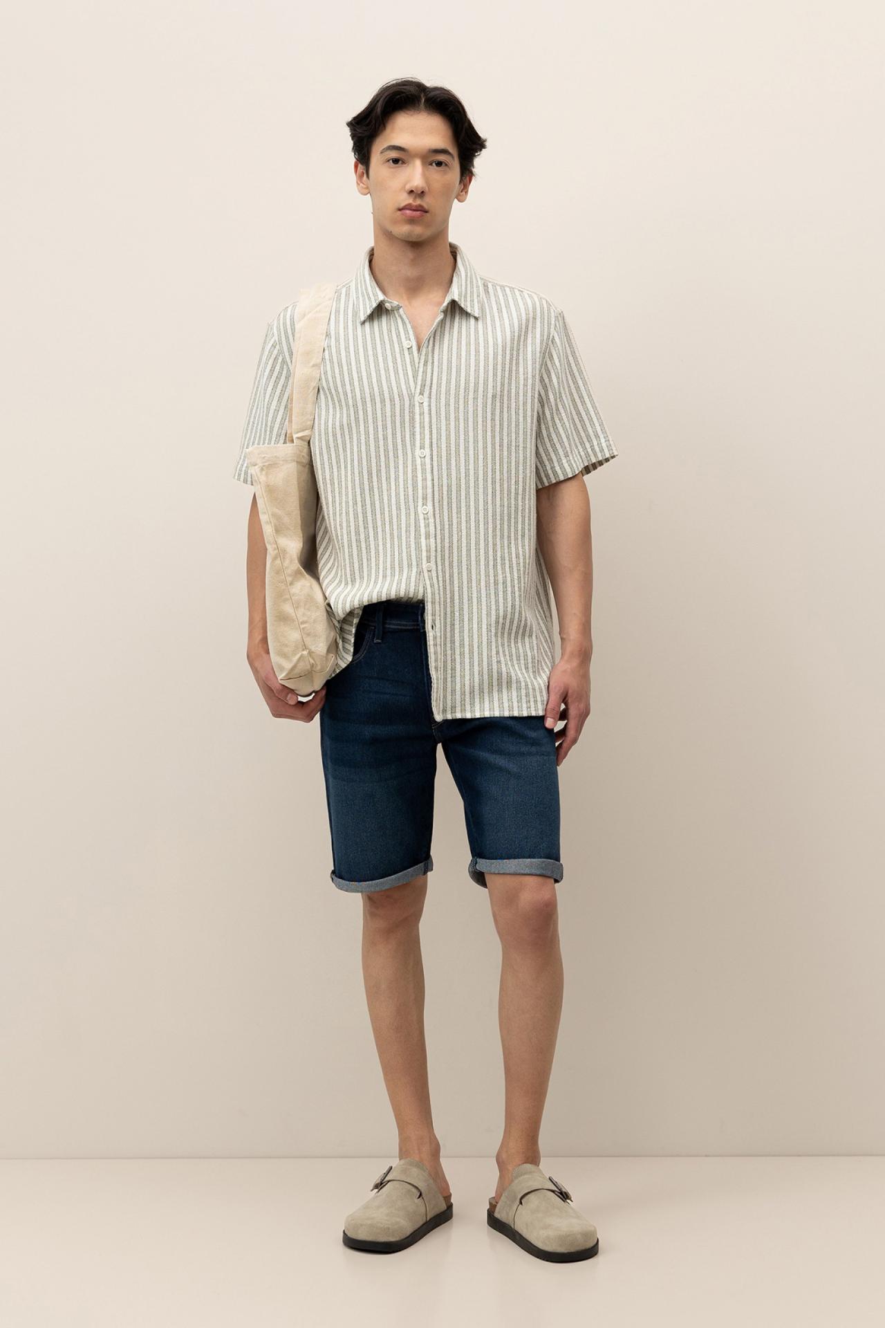 Pantalones cortos vaqueros comfort fit, con cinco bolsillos, lavado oscuro y dobladillo vuelto. Abertura frontal con cierre de cremallera y botón.
