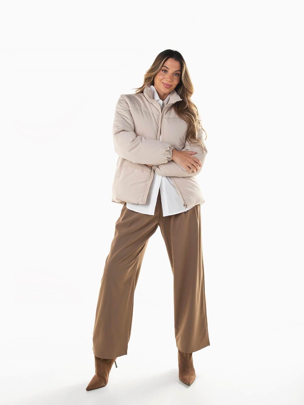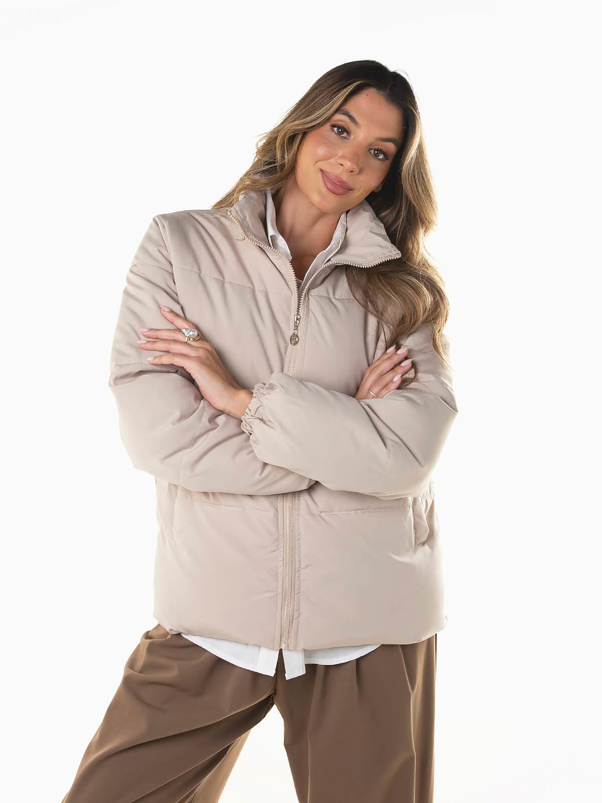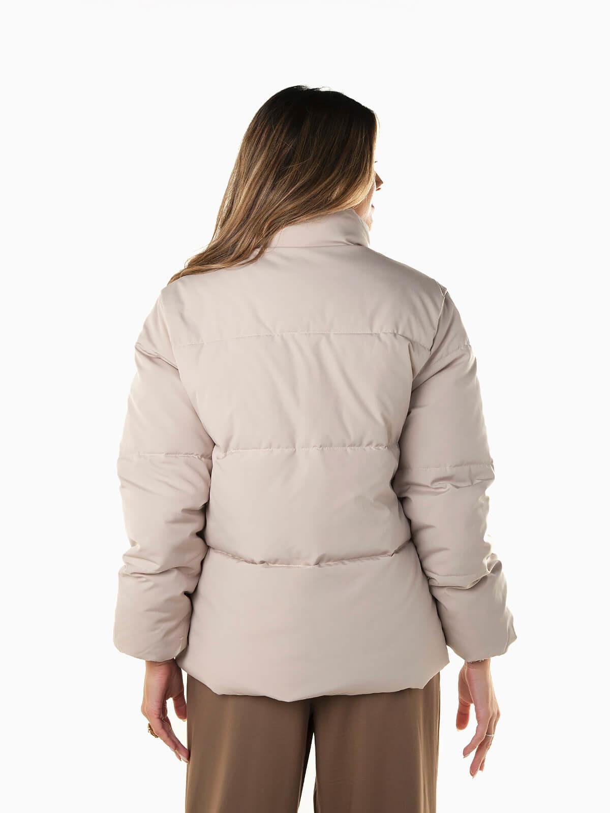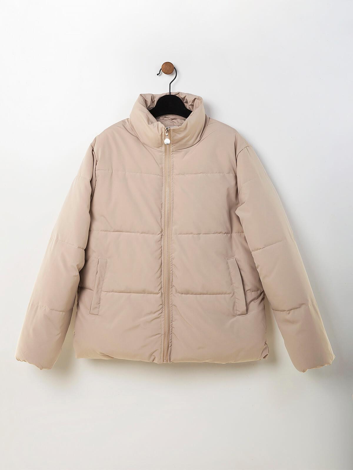 Chaqueta acolchada color beige claro con cuello alto y cierre frontal con cremallera. Cálida y cómoda, con dos bolsillos laterales y acabado impermeable. Imprescindible para los días fríos, combina estilo y funcionalidad.