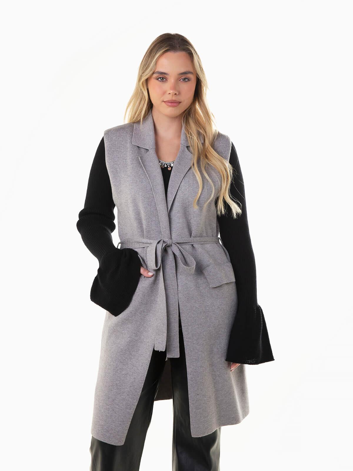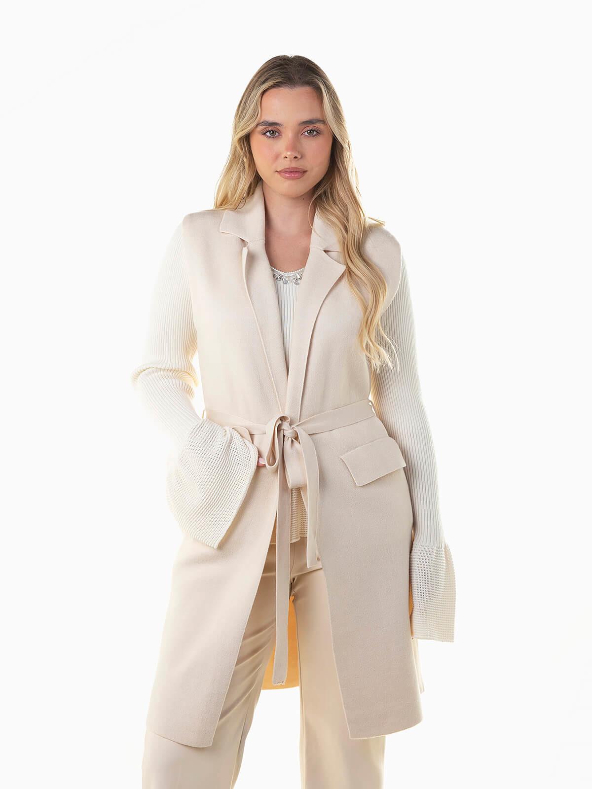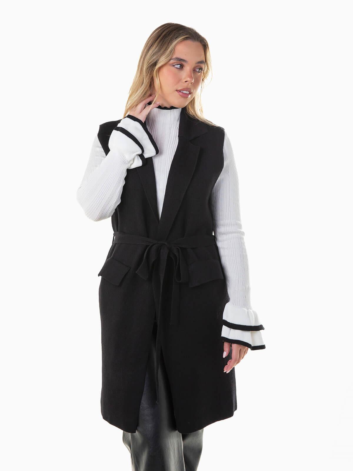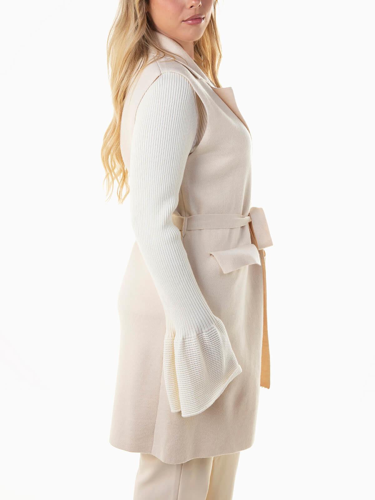 Chaleco largo de tejido estructurado con cuello de solapa y dos bolsillos con solapa. Cinturón a juego para ajustar la cintura. Combina a la perfección con camisas blancas o jerséis de cuello alto para un look elegante y sofisticado.