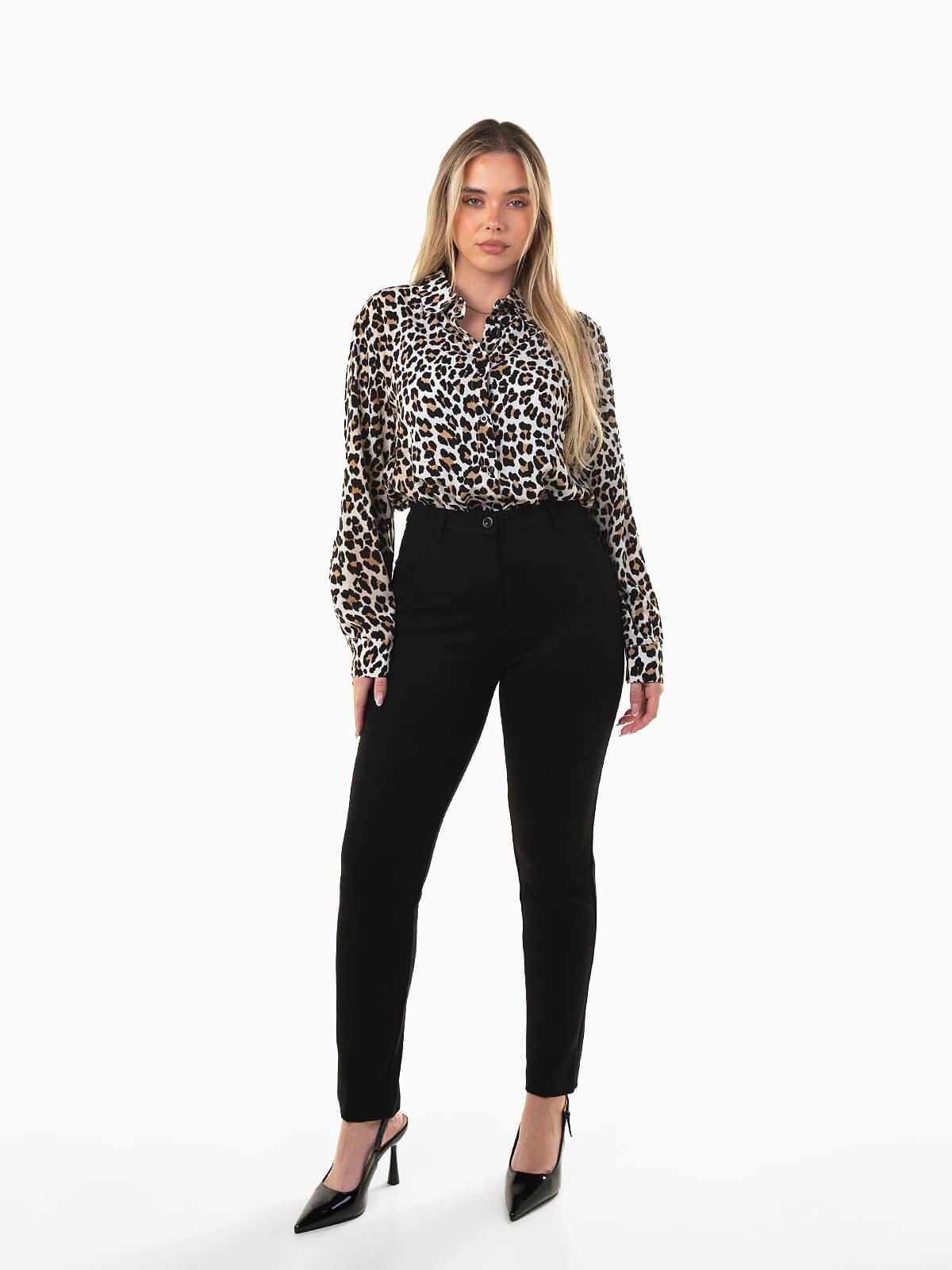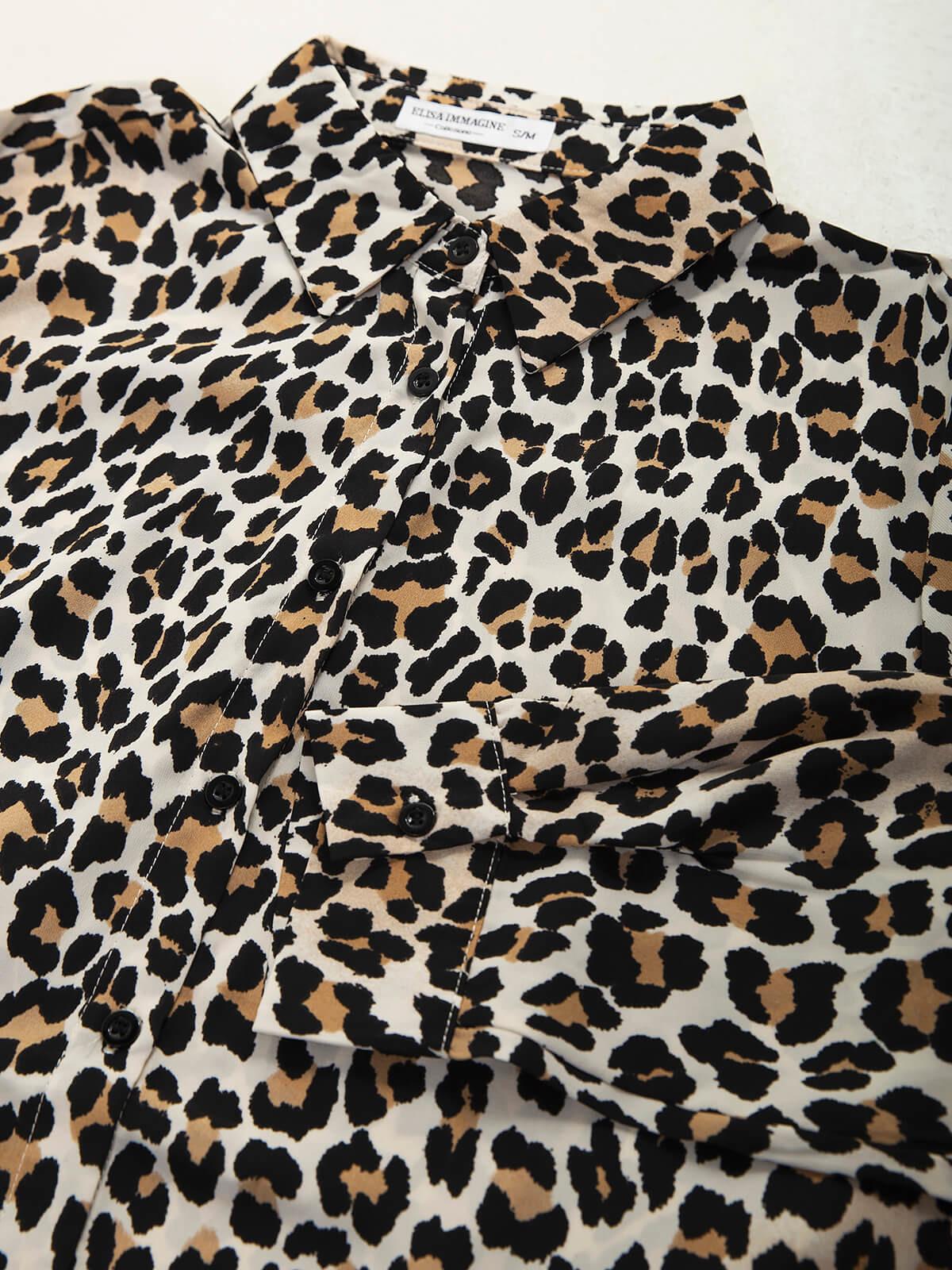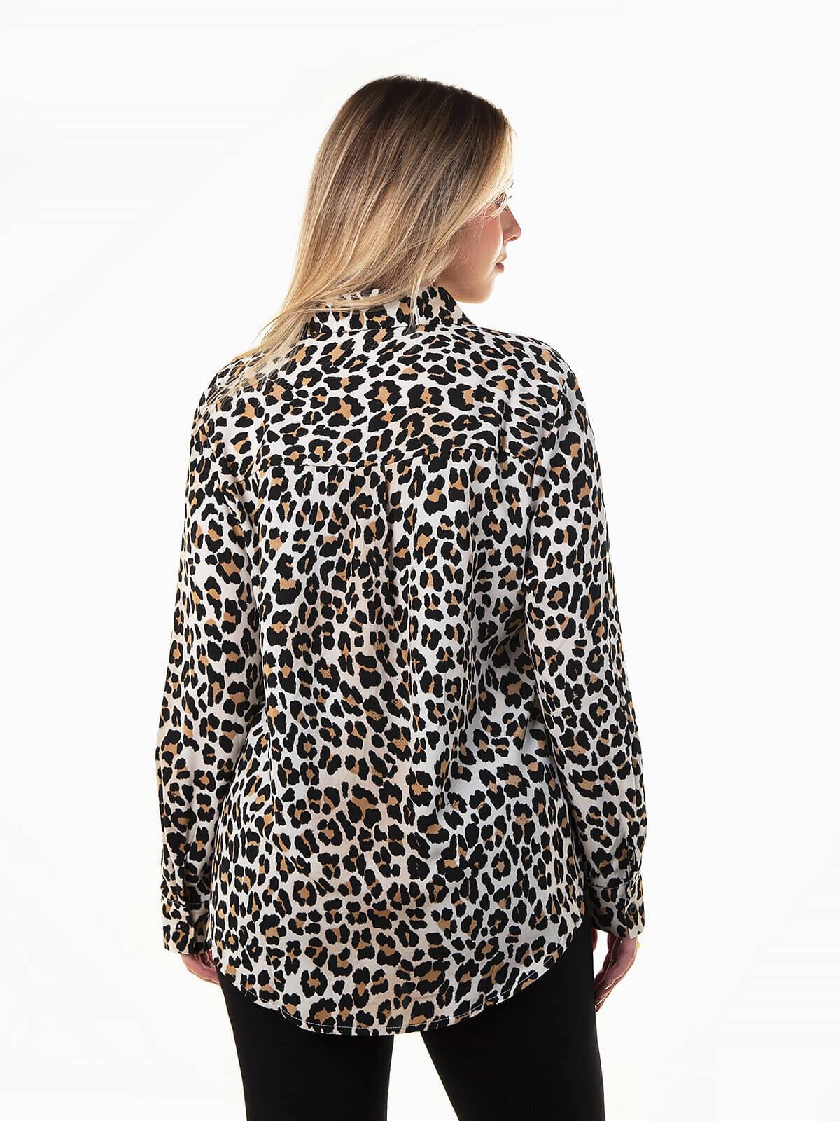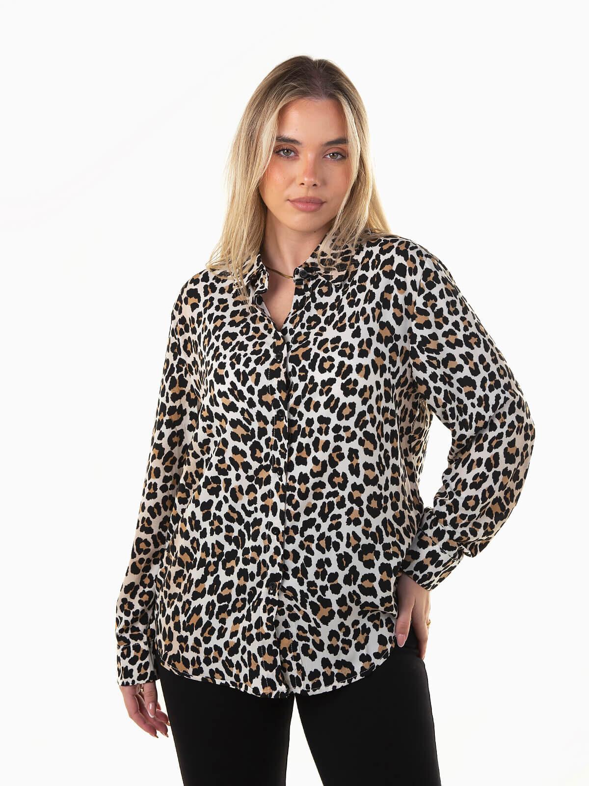 Camisa beige con estampado de leopardo, manga larga y puños abotonados. El modelo cuenta con cuello y cierre de botones frontal. Un clásico reinventado que aporta un toque moderno y atrevido a cualquier look, ideal con vaqueros o pantalones de vestir.